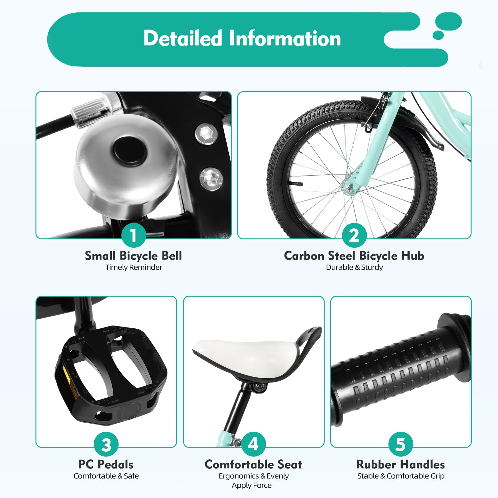 Estabeter 16-Zoll-Kinderfahrrad, Höhenverstellbar Sitze Fahrrad Kohlenstoffstahl Kinder Fahrrad für 5-8 Jahre Jungen Mädchen, 3 Rad Kinderfahrrad mit Stützrädern, Grün