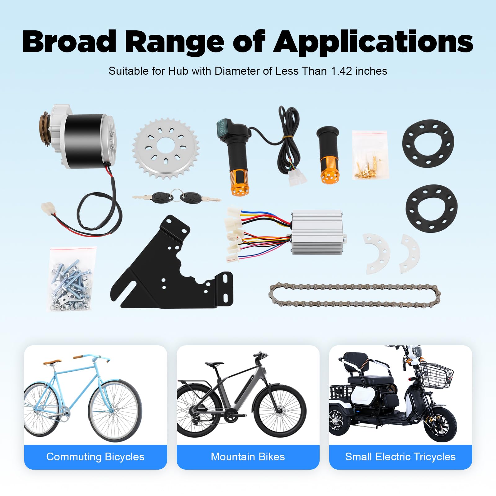 1. Dieses Produkt enthält weder Fahrrad noch Akku oder Ladegerät. Es ist für Fahrräder mit einem Radnabendurchmesser von weniger als 3,6 cm geeignet.