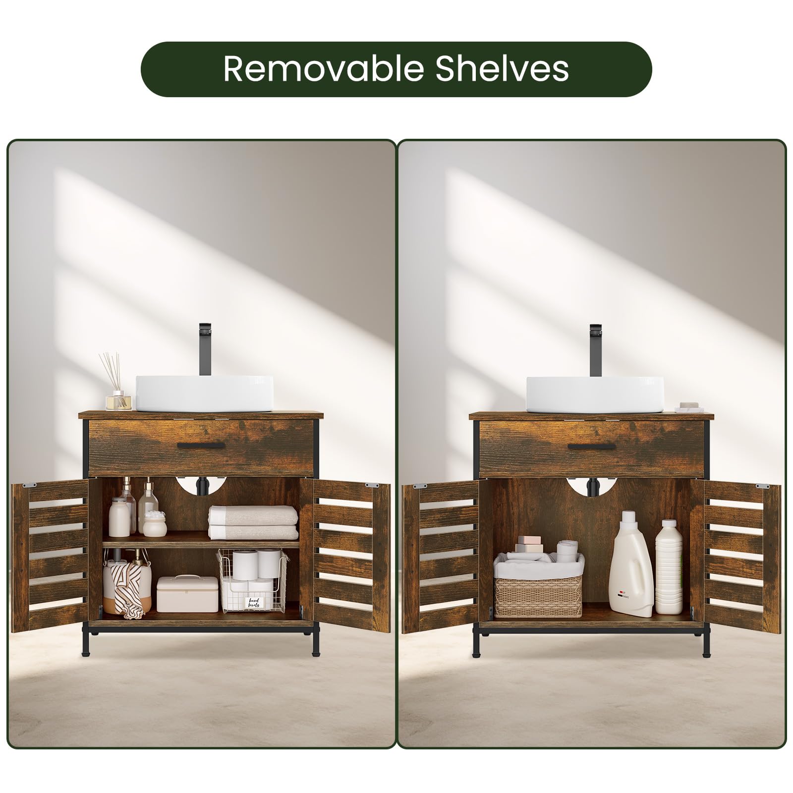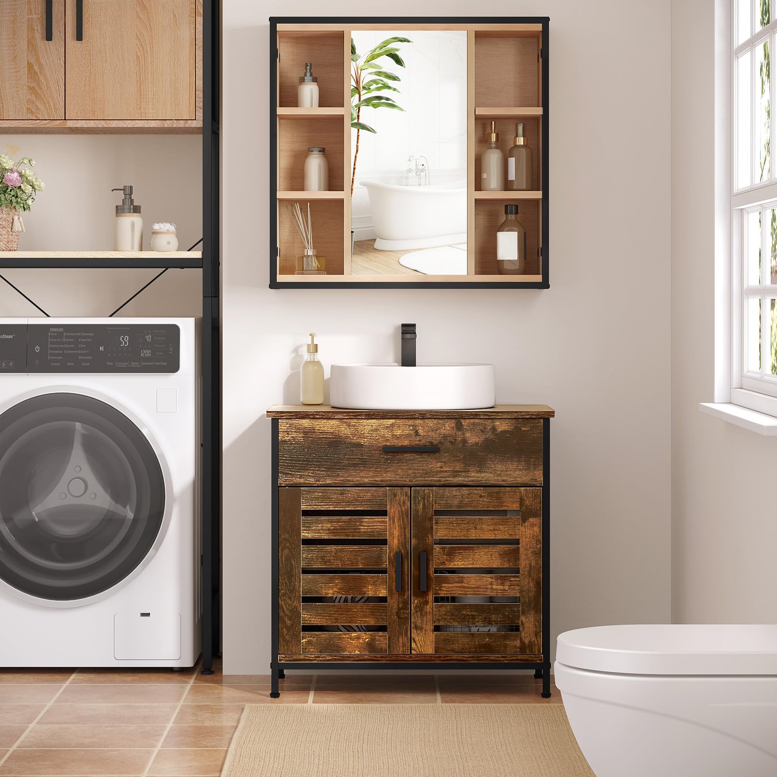 - Robust & Langlebig: Der Waschbeckenunterschrank ist aus hochwertigen E1-MDF-Platten gefertigt, die eine solide Struktur und eine hohe Tragfähigkeit mitbringen. Die Oberfläche mit Melaminfurnier ist wasserabweisend und abriebfest für eine lange Nutzungsdauer. Die ausgewählten Zubehörteile aus Kohlenstoffstahl sind robust und langlebig und bieten Ihnen einen hochwertigen Badezimmerschrank