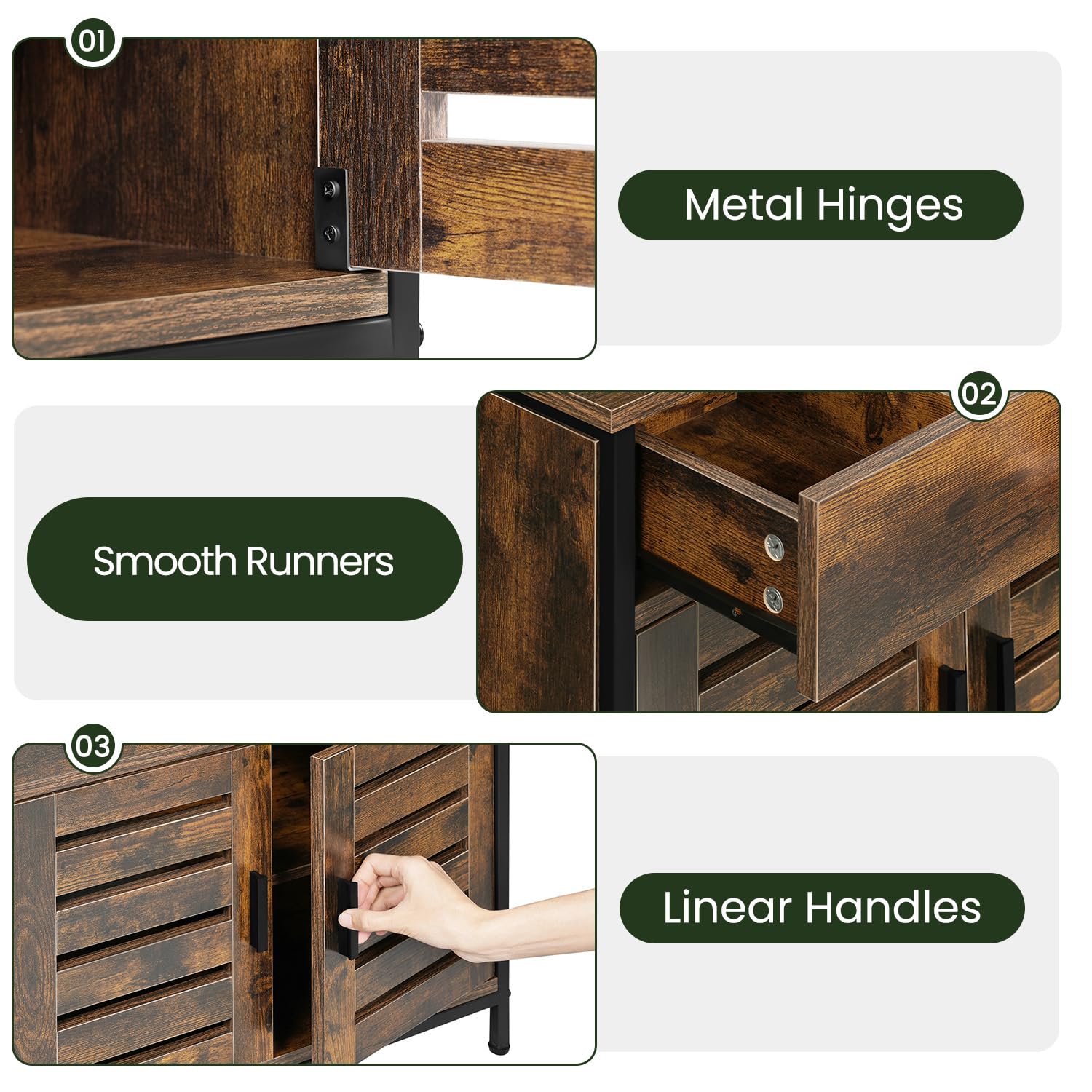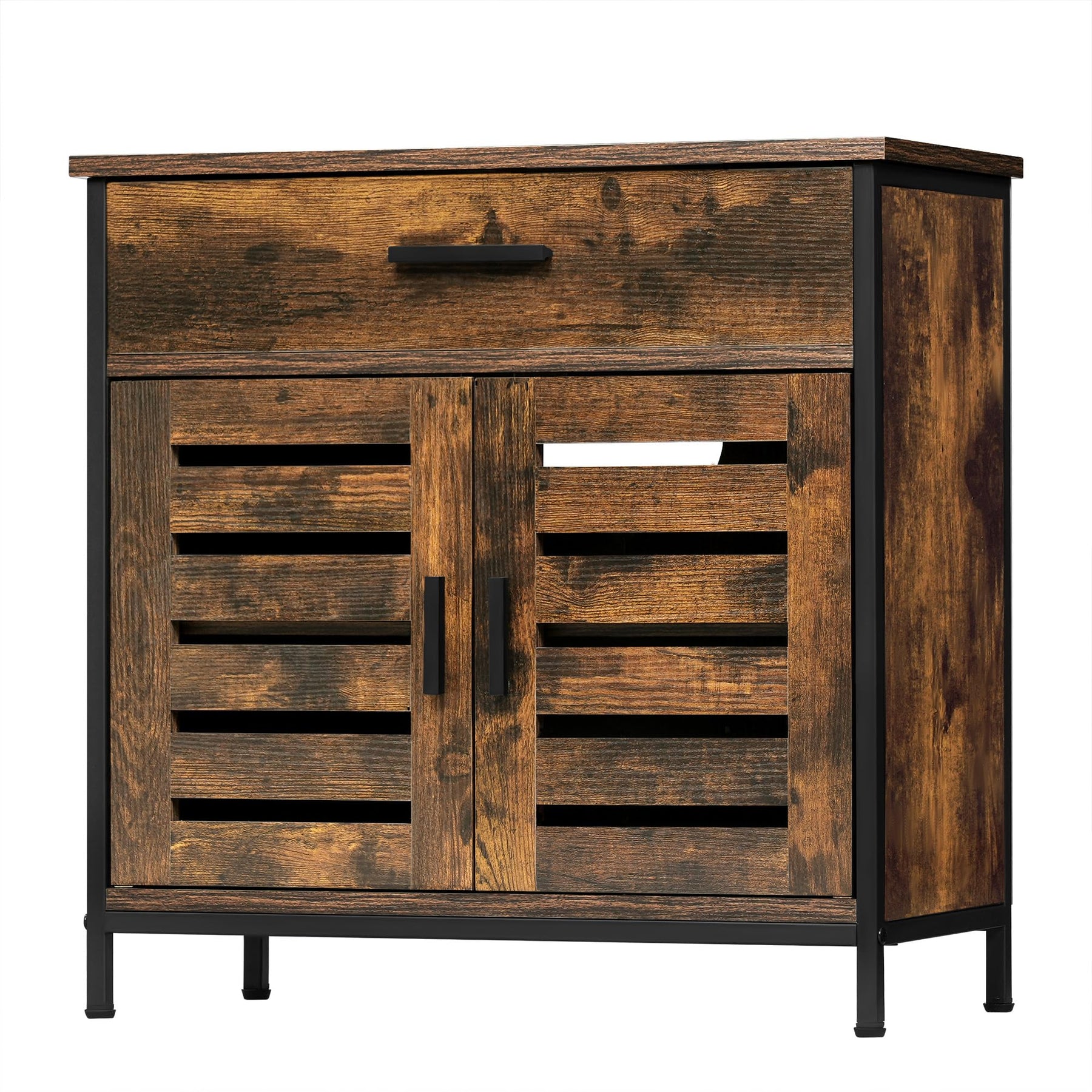 - 2 Lamellentüren: Sie schützen vor Staub und Feuchtigkeit und sorgen für eine gute Belüftung im Inneren des Badunterschranks. Ausgestattet mit Metallgriffen, Scharnieren aus Kohlenstoffstahl und Magnetverschluss lassen sich die Türen leicht öffnen und eng schließen