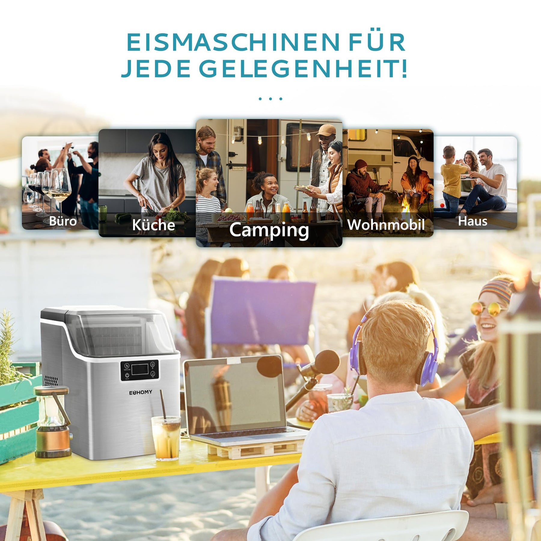 • Einfache Bedienung und superleise: Das LCD-Display mit Tastendesign und die ausführliche Bedienungsanleitung erleichtern die Bedienung der Eiswürfelmaschine. Alles, was Sie tun müssen, ist Wasser hinzuzufügen und die EIN/AUS-Taste zu drücken, damit die Maschine mit der Eisproduktion beginnen kann! Die Anzeige erinnert Sie daran, die Eiswürfel aus dem Eiskorb zu entfernen. Der Geräuschpegel der Eismaschine beträgt ca. 45 dB und stört niemanden auf Partys, beim Camping oder im Büro.