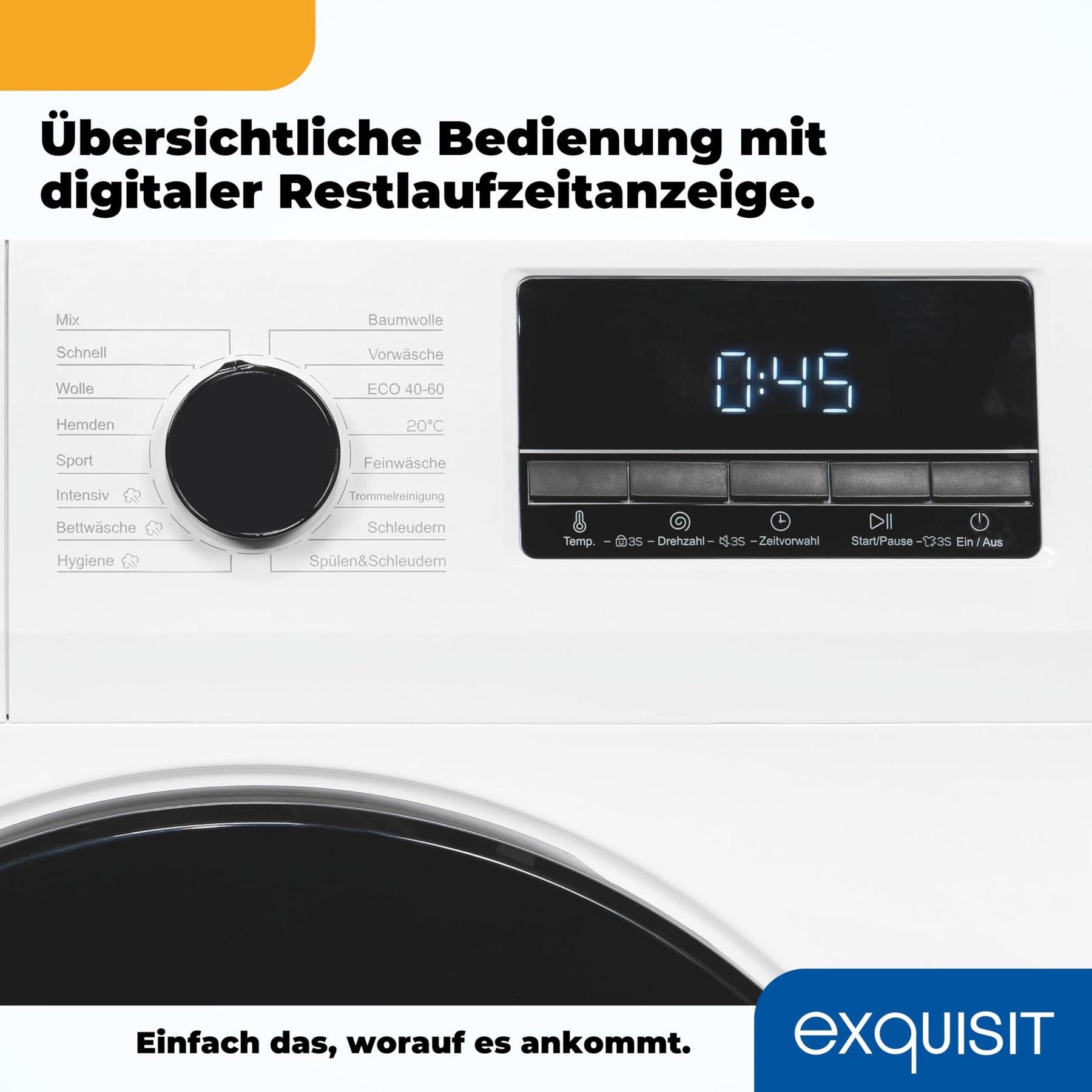- Das Display informiert über den aktuellen Status und die Restzeit, während die Startzeitvorwahl und die Kindersicherung zusätzlichen Komfort bieten