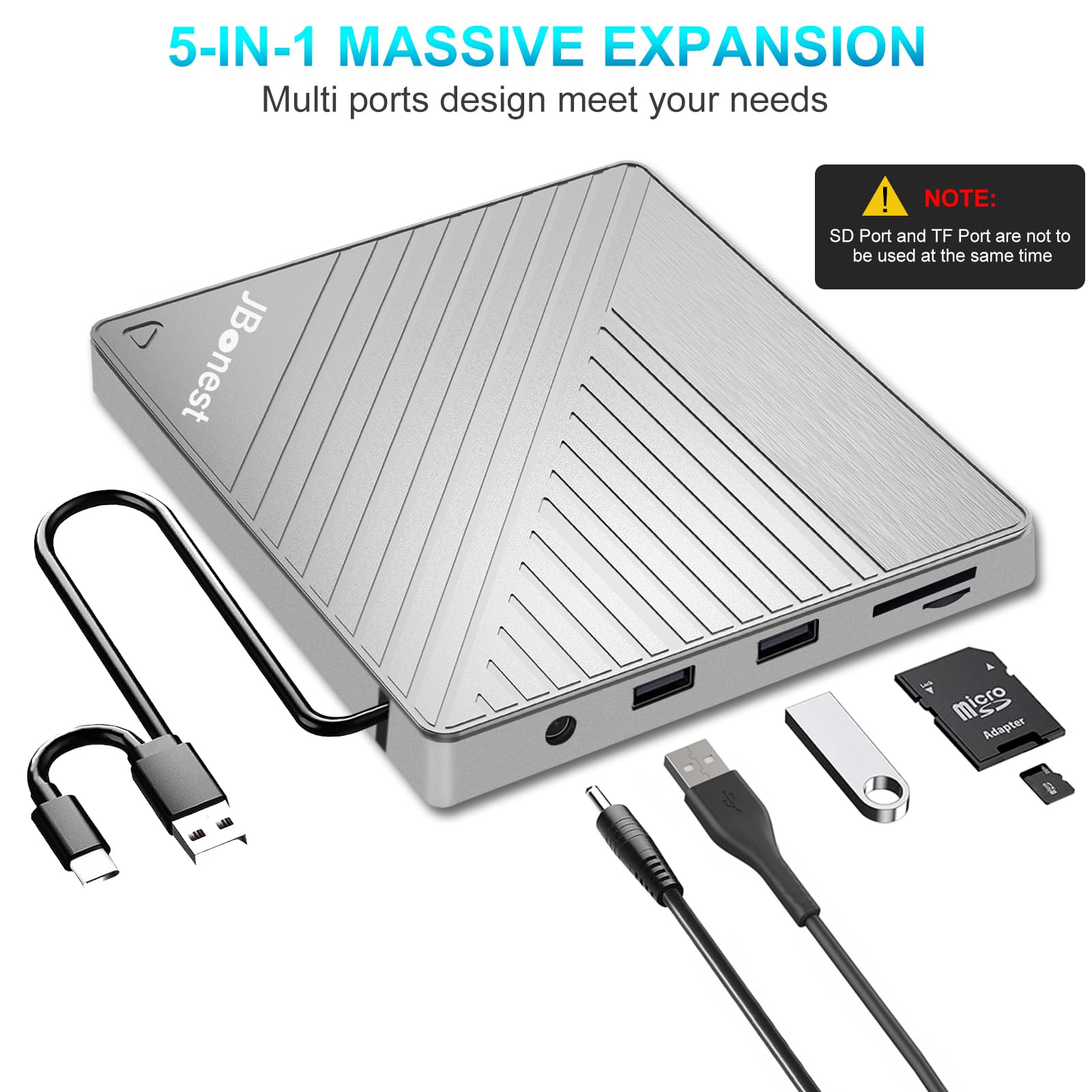 • 【High Speed】CD-ROM-Laufwerk mit fortschrittlicher Brenntechnologie, Z. B. unterstützter CD-R, CD-RW, DVD-R, DVD-RW. Max DVD-ROM Lesegeschwindigkeit 8X; Max CD-ROM-Lesegeschwindigkeit 24X und maximale DVD-Brenngeschwindigkeit 8X;Max CD-Brenngeschwindigkeit 24X. Externes CD laufwerk verfügt über zwei USB-Anschlüsse, 1 Micro-USB-Anschluss, 1 SD-Steckplatz und 1 TF-Steckplatz. PS: SD-Anschluss und TF-Steckplatz dürfen nicht gleichzeitig verwendet werden. Der Micro-USB-Anschluss dient nur zum Laden.