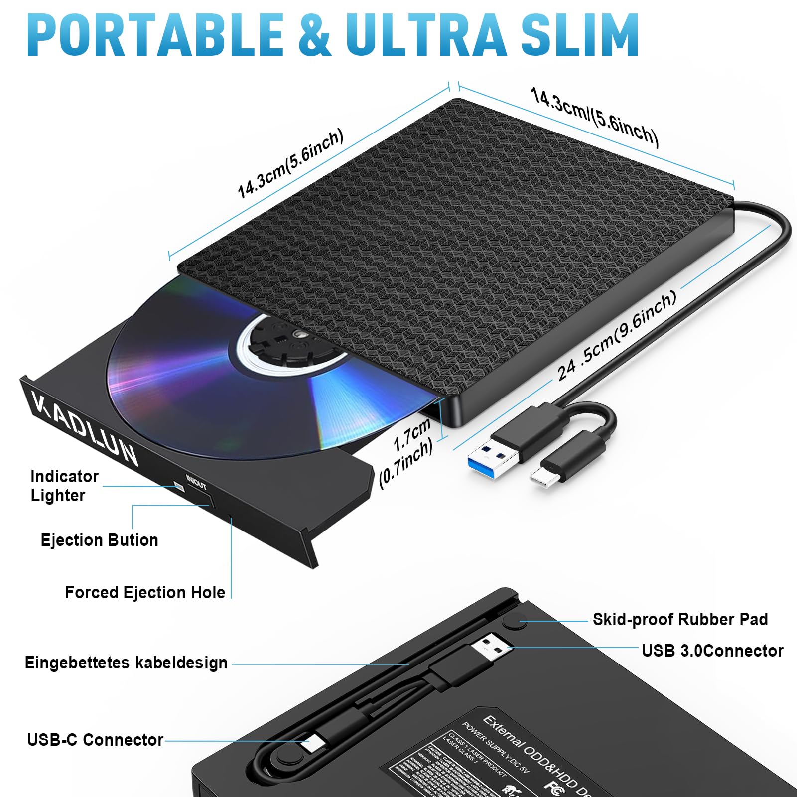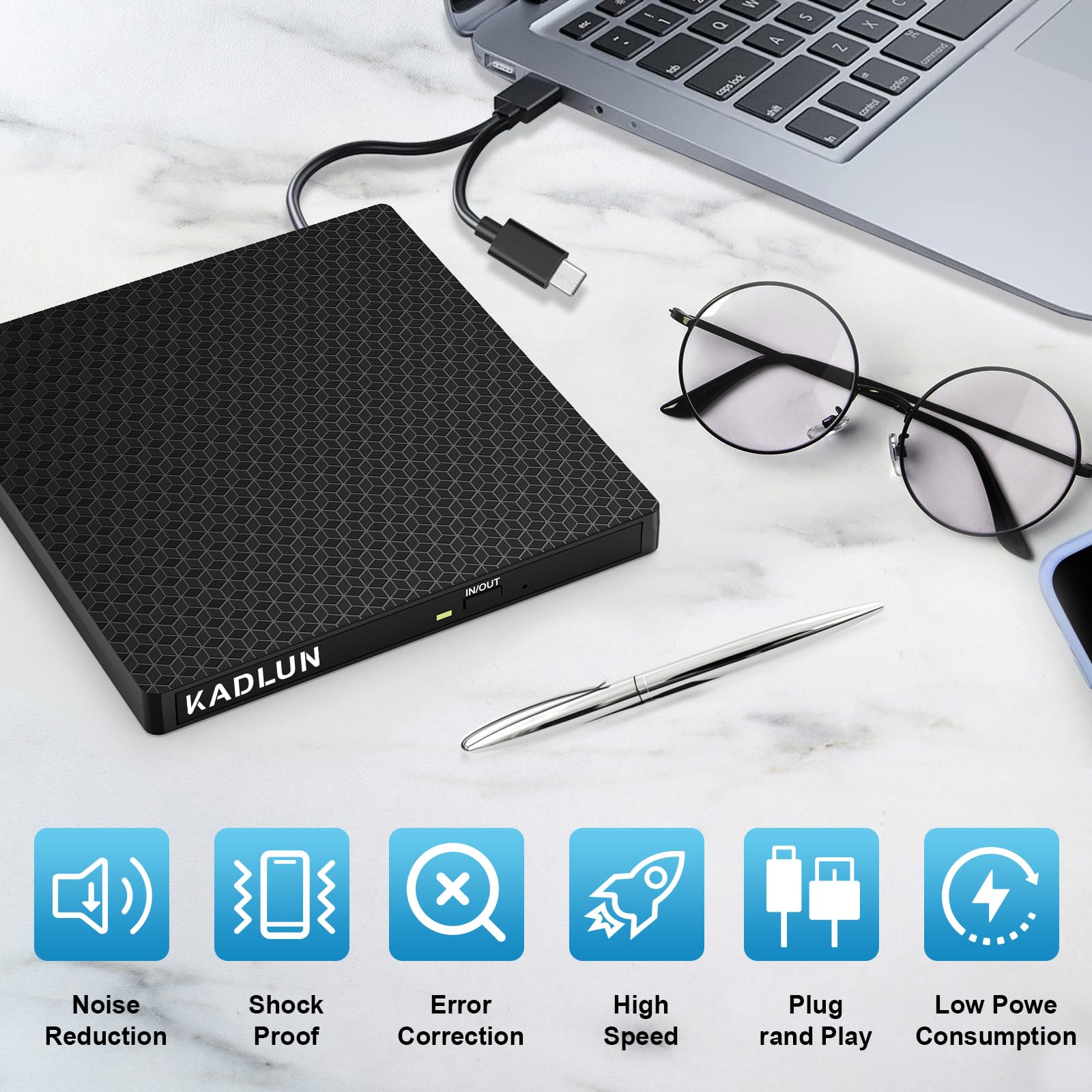 - 【USB 3.0 Externes DVD Laufwerk】KADLUN cd brenner extern mit fortschrittlicher Brenntechnologie, unterstützt DVD+R, DVD, CD-ROM, DVD-ROM, CD-R, CD-RW etc. DVD Player Mit USB 3.0 und Typ-C-Schnittstelle. Maximale DVD-Lesegeschwindigkeit 8 x, maximale CD-Lesegeschwindigkeit 24 x und maximale CD-Brenngeschwindigkeit 8 x. bietet Ihnen schnellere Datenübertragungsgeschwindigkeit (max. 5 Gbit/s), spielt Musik und Filme ohne Verzögerung oder Verzerrung