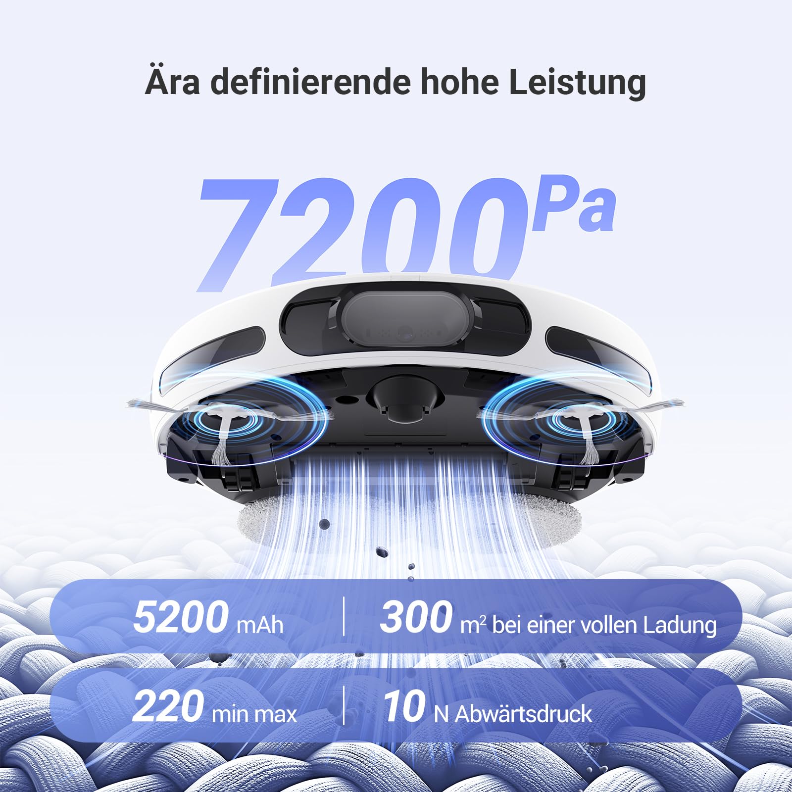 - Erkennung der Umgebung: Durch die Integration von LDS LiDAR, 3D-Laser und einer KI-Kamera kann der Roboter Hindernissen effektiv ausweichen. Wenn der Roboter im Saugmodus einen Teppich erkennt, erhöht er außerdem die Saugleistung. Im Wischmodus vermeidet der Roboter automatisch Teppiche, um Flecken auf diesen zu vermeiden