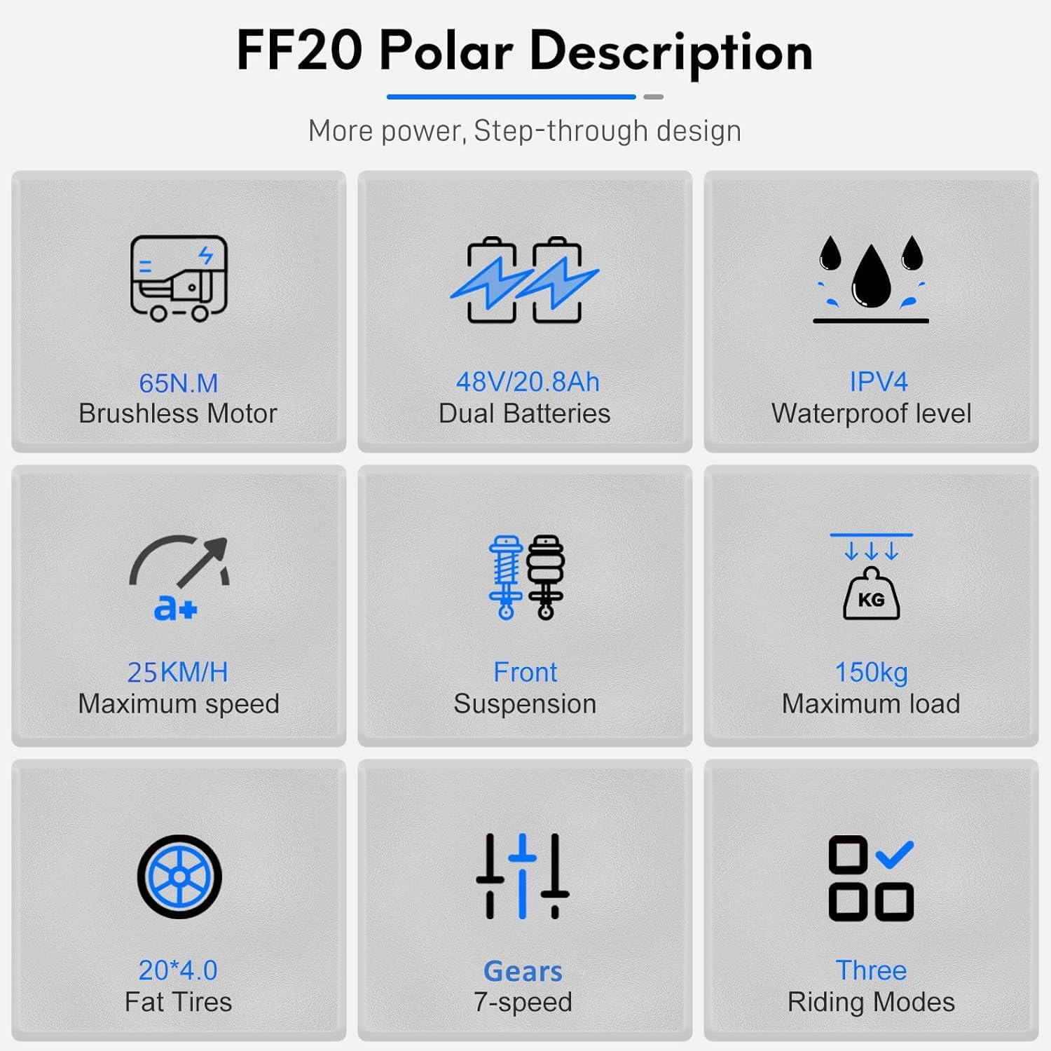 20 x 4.0 Fat Tires ︎ FF20 Polar ist ein 20 Zoll Elektro-Fatbike. 4,0 Fat Reifen mit erhöhter Reibung, der sich an eine Vielzahl von Fahrbedingungen anpassen kann, einschließlich flachem Gelände und Schnee, Sand, Schlamm und unbefestigten Straßen.
