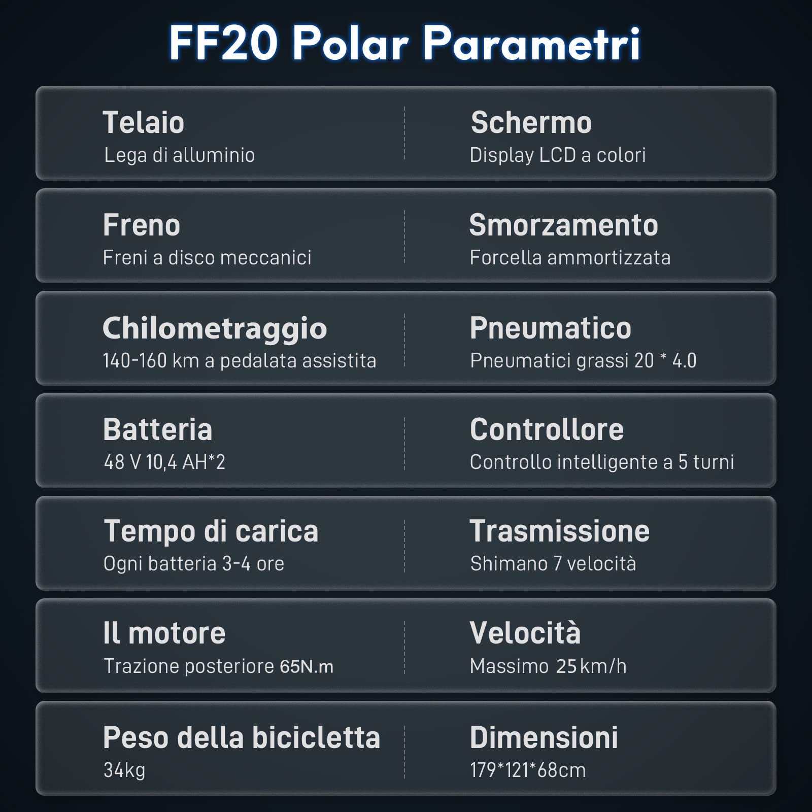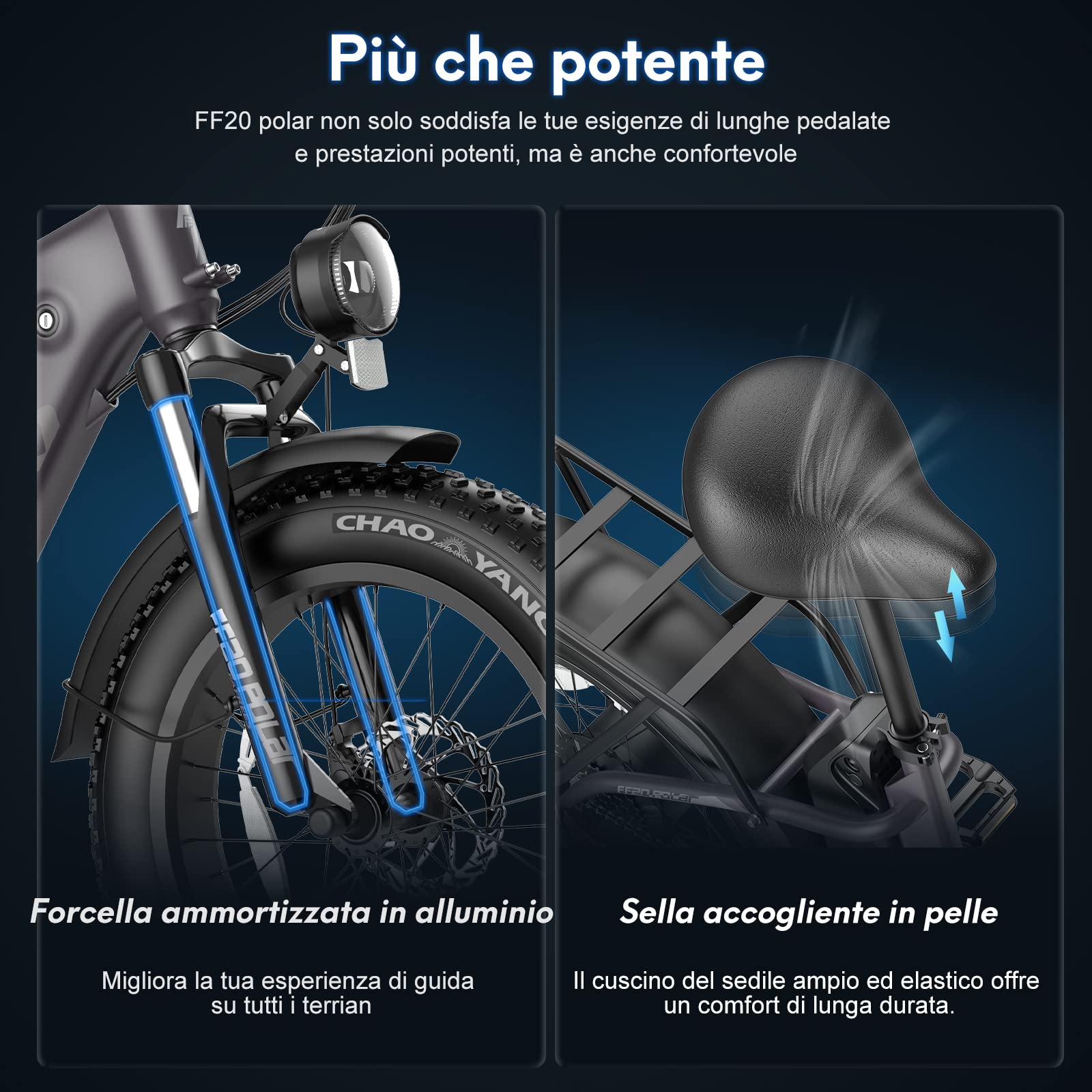 20 x 4.0 Fat Tires ︎ FF20 Polar ist ein 20 Zoll Elektro-Fatbike. 4,0 Fat Reifen mit erhöhter Reibung, der sich an eine Vielzahl von Fahrbedingungen anpassen kann, einschließlich flachem Gelände und Schnee, Sand, Schlamm und unbefestigten Straßen.