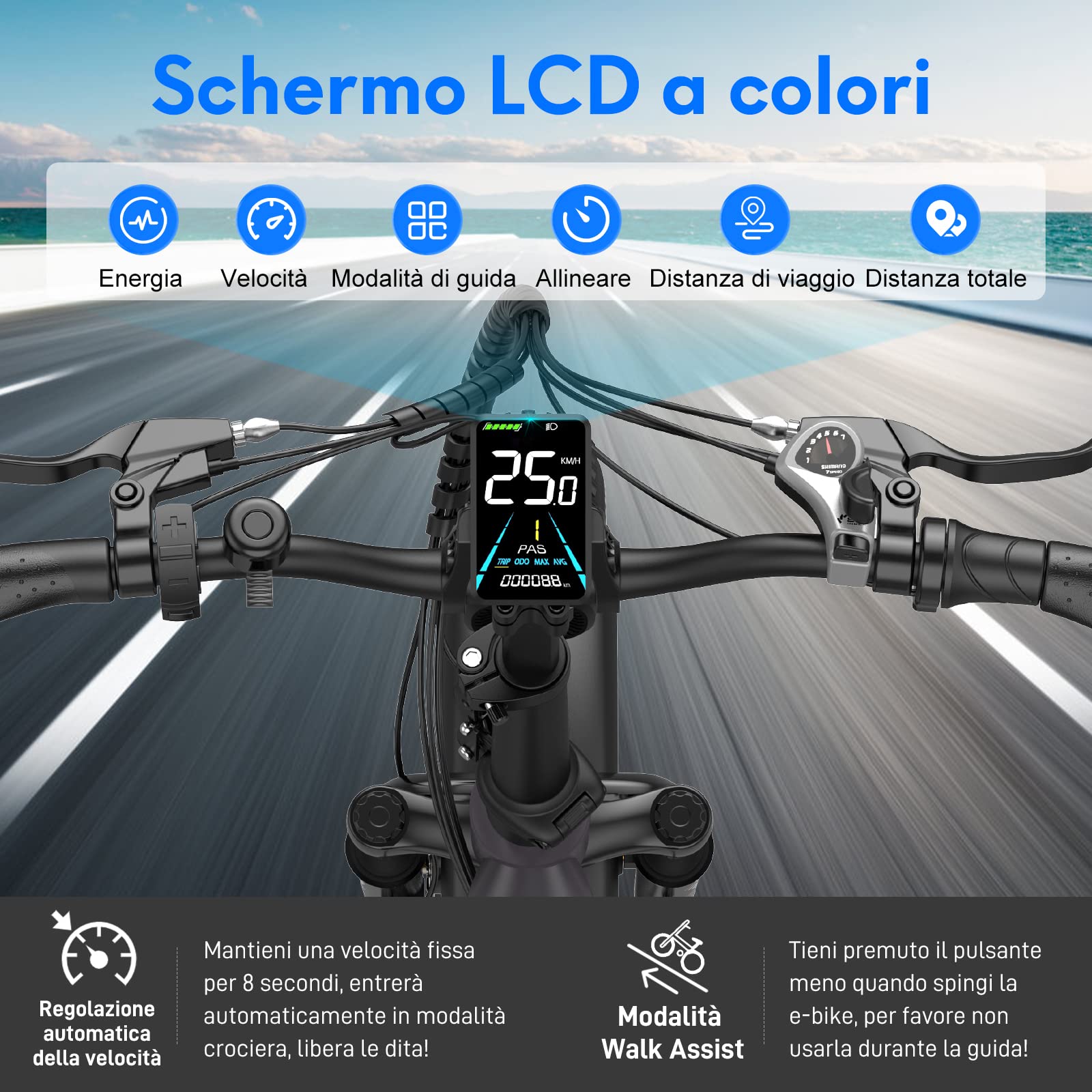 Farb-LCD-Display ■︎ Dieses E-Bike mit einem hochauflösenden LCD-Display bietet eine Vielzahl von Funktionen mit einfacher Steuerung und voreingestellten 5 Geschwindigkeitsstufen. Das Smart-LCD-Display mit großem Bildschirm zeigt verschiedene Daten wie Geschwindigkeit, Akku, Kilometerstand und Ganganzeige an. Es verfügt über einen Gehassistenzmodus und eine automatische Geschwindigkeitssteuerungsfunktion, um Ihnen zu helfen, wann immer Sie es brauchen.