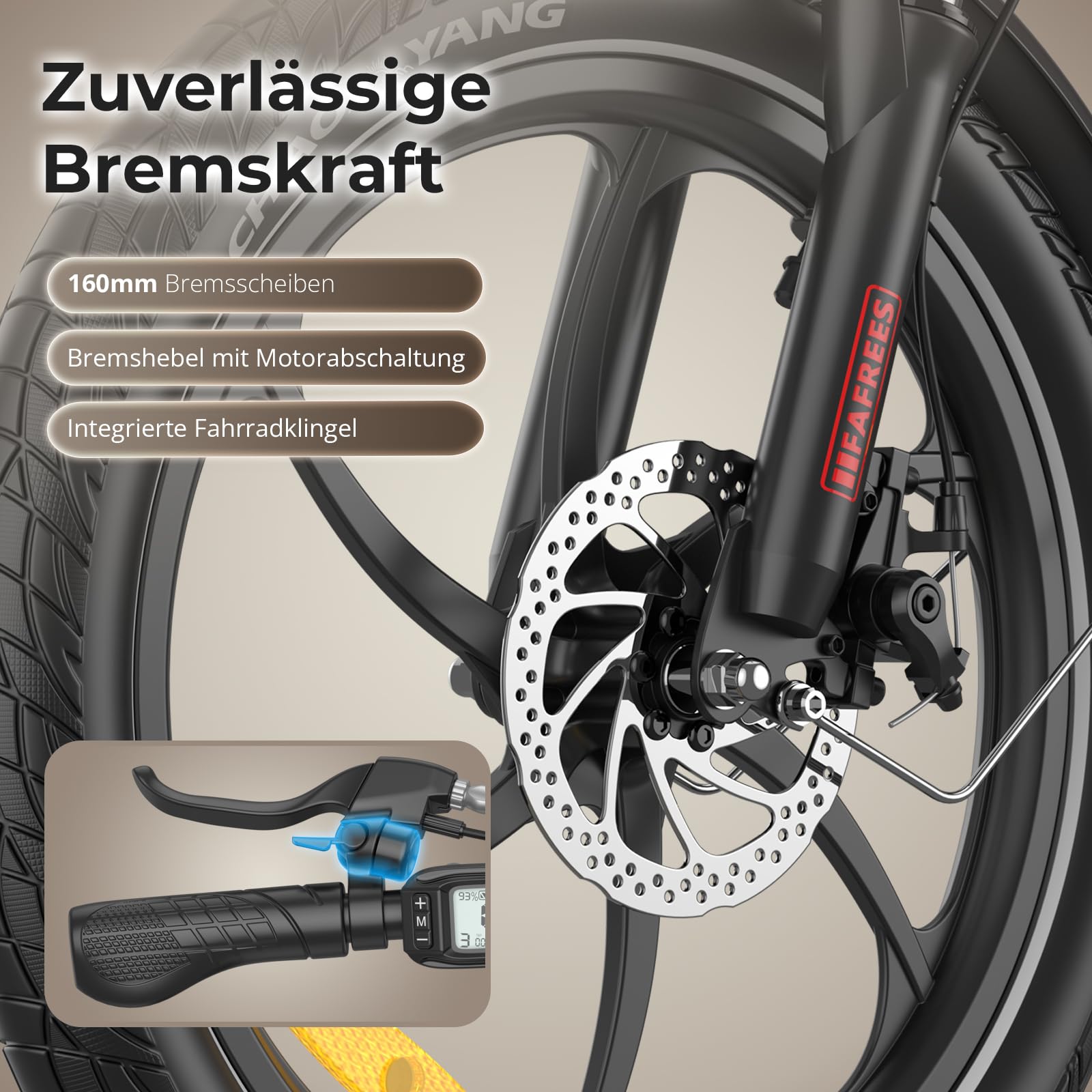 - 【Sicherheit steht an erster Stelle】denn 160mm Scheibenbremsen, ein Abschaltbremshebel und ein integrierter Lenker sorgen für zuverlässige Bremskraft. Für zusätzlichen Komfort sorgen der kompakte Klapprahmen, der Lenker und die Pedale dafür, dass der F20+ einfach verstaut und transportiert werden kann – perfekt für den Weg zur Arbeit in der Stadt oder für Outdoor-Abenteuer.