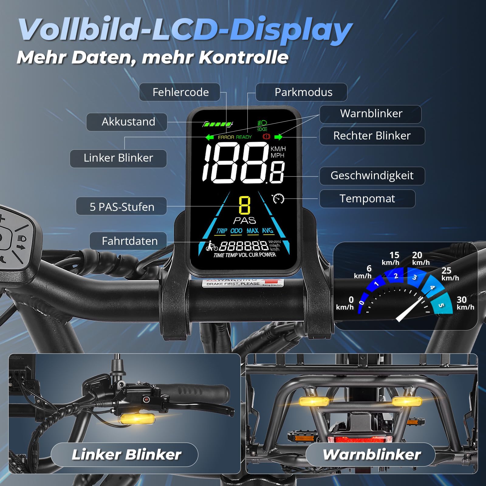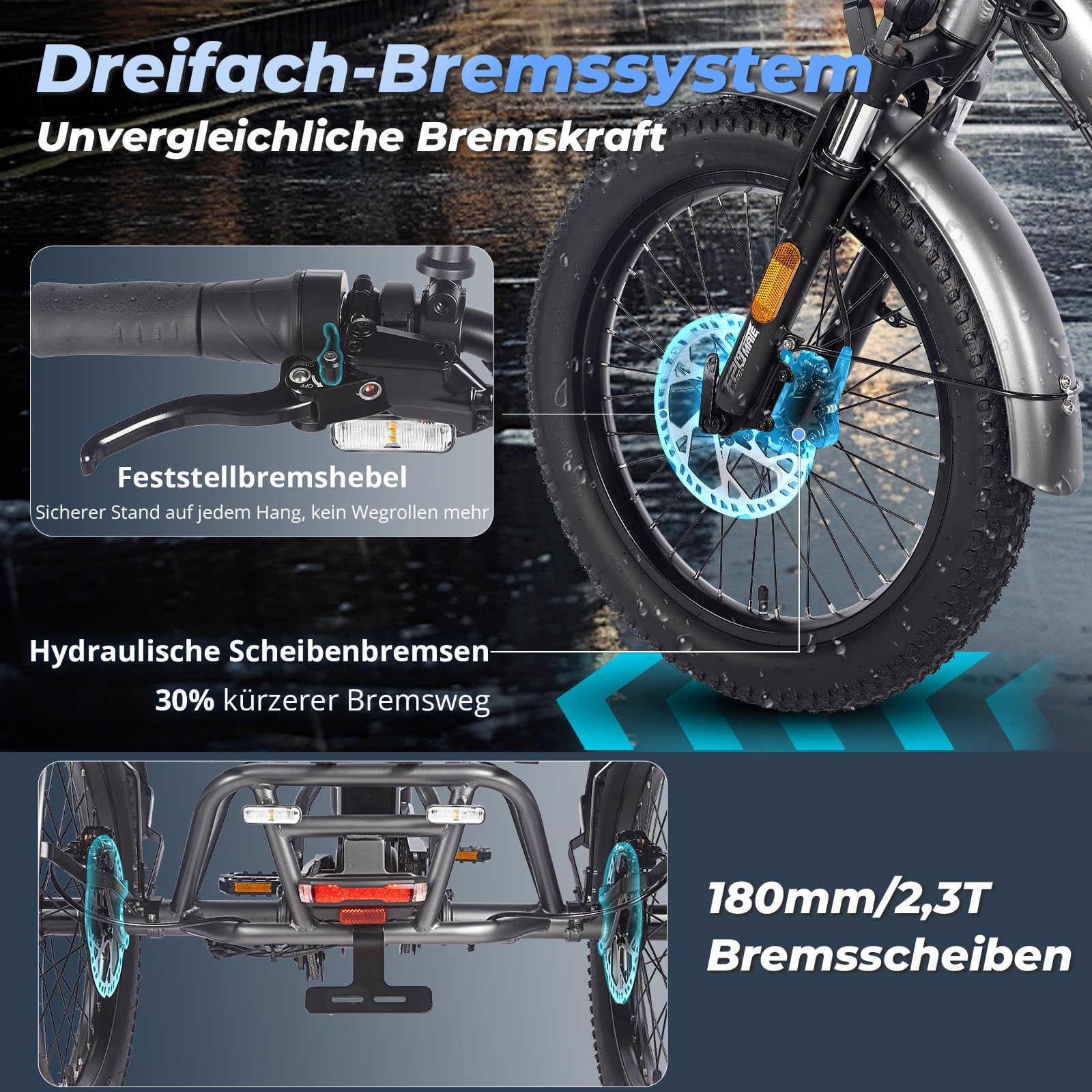 - 【Hydraulische Bremsen】Das e-bike 3 rad wurde von doppelten hydraulischen Vorder- und Hinterbremsen auf dreifache hydraulische Vorder- und Hinterbremsen aufgerüstet, wodurch die Präzision und Reaktionsfähigkeit des sicheren Fahrens neu definiert wurde. Es kann rechtzeitig auf Notfälle reagieren und das Fahrrad beim Bremsen stabiler machen