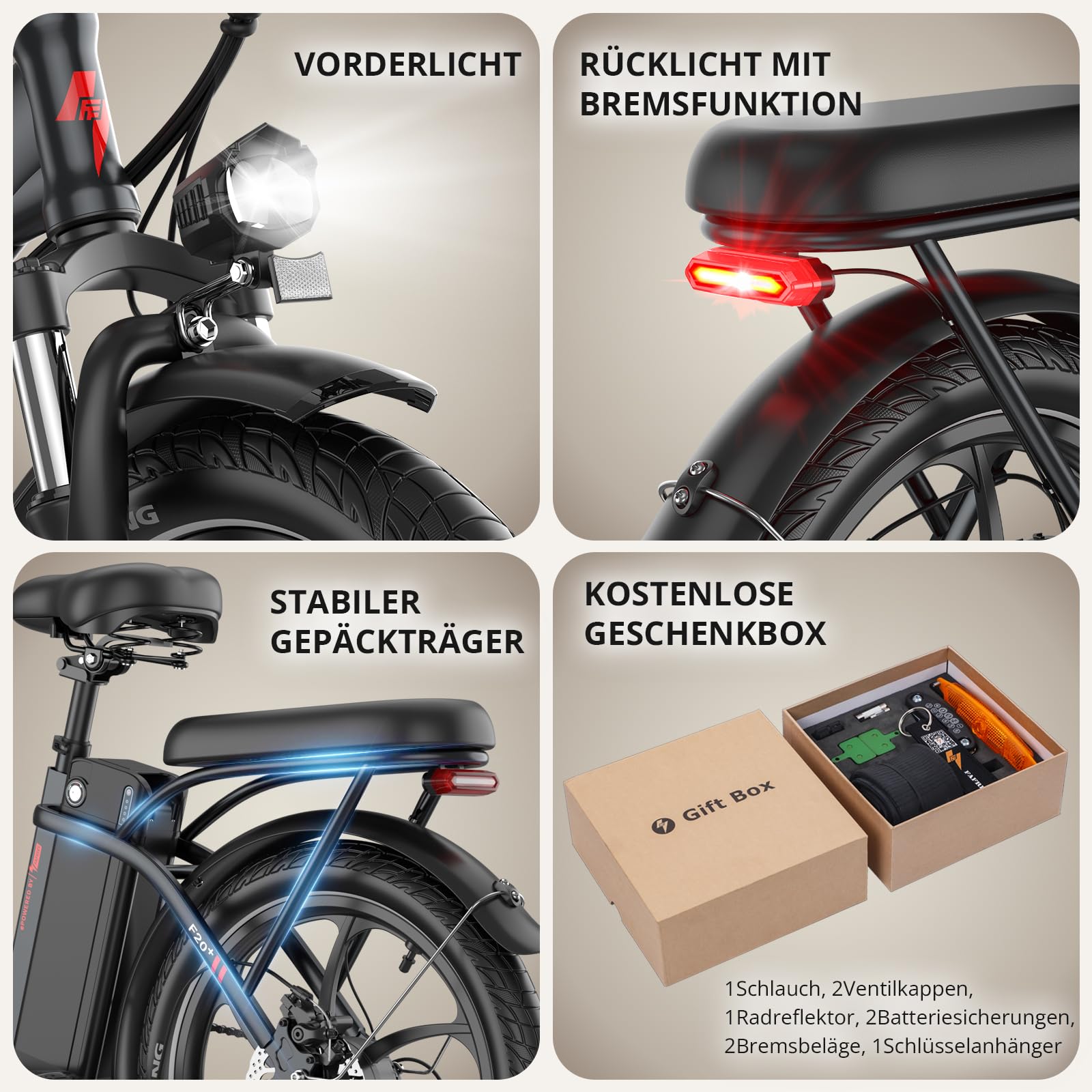 - [Praktische Zusatzfunktionen]: Neben seiner Leistung und Sicherheit bietet der F20+ auch praktische Zusatzfunktionen. Dazu gehören ein heller Frontscheinwerfer, ein Rücklicht bei Bremsen, ein starker Heckträger und ein kostenloses Zubehörset mit wichtigen Ersatzteilen.