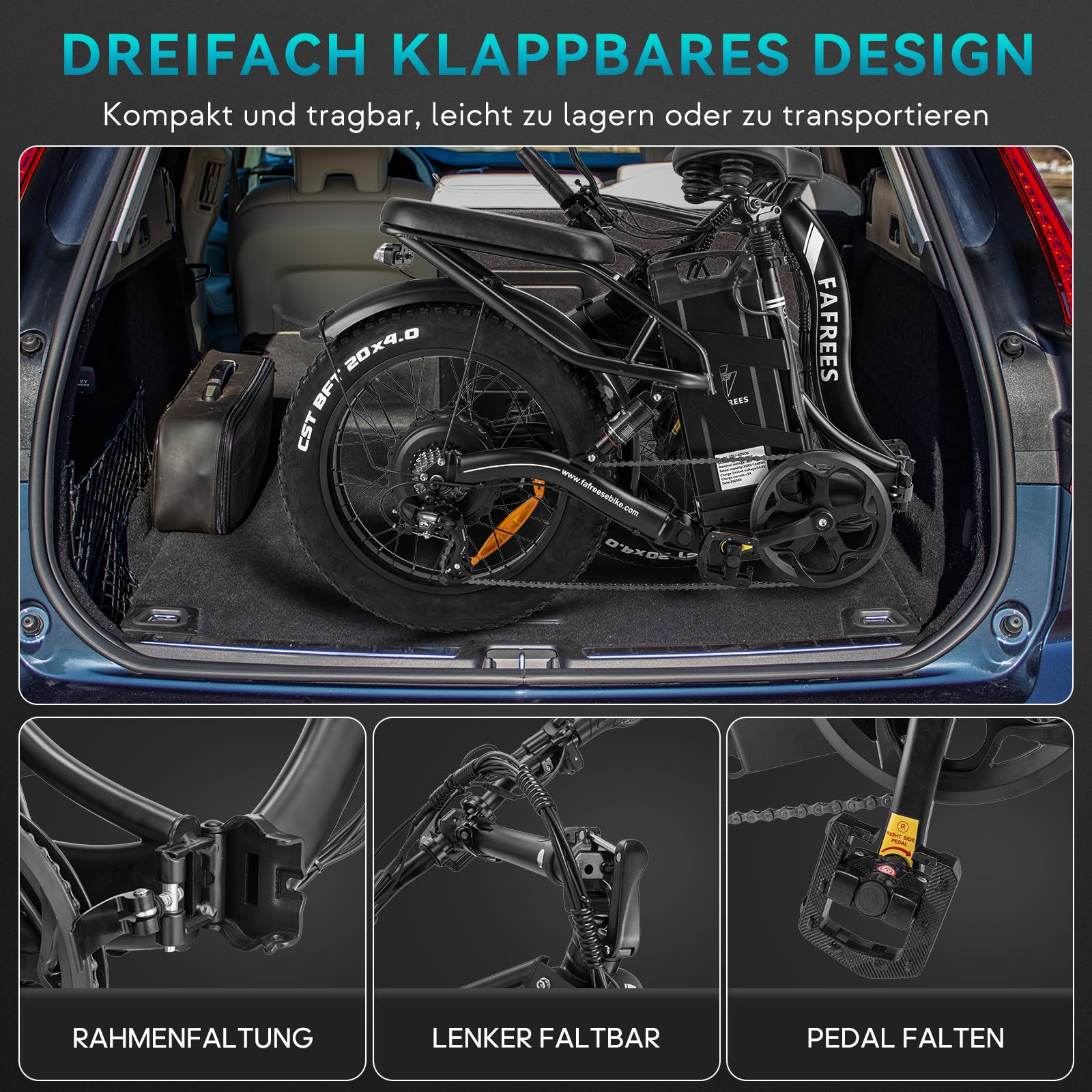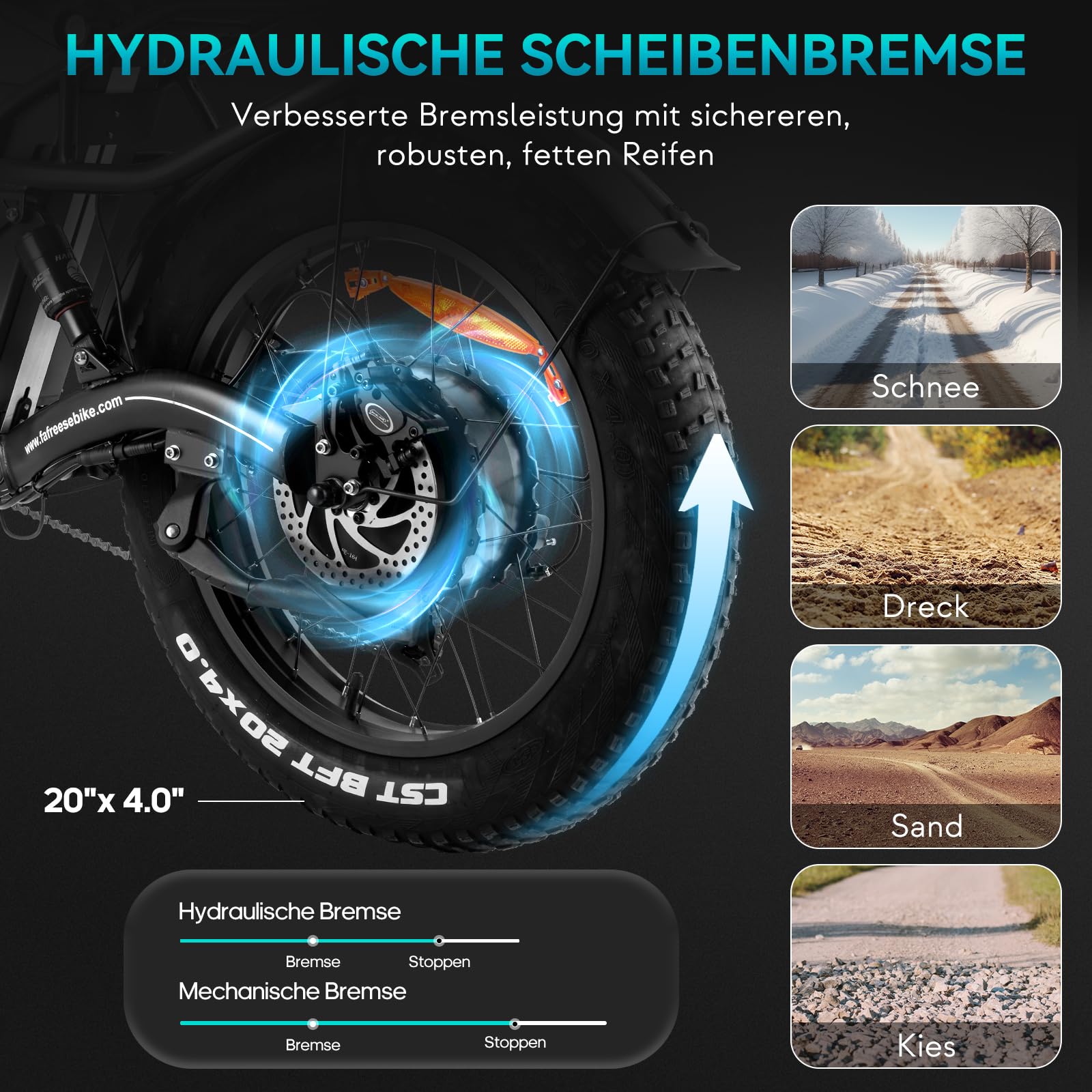 - 【20" * 4.0 Zoll dicker Reifen】4.0 Fat Reifen des klapprad e-bike mit stärkerer Reibung, der sich an eine Vielzahl von Fahrumgebungen wie Schneestraßen, Sandstraßen, Schlammstraßen, Schotterstraßen und auch flaches Gelände anpassen kann.