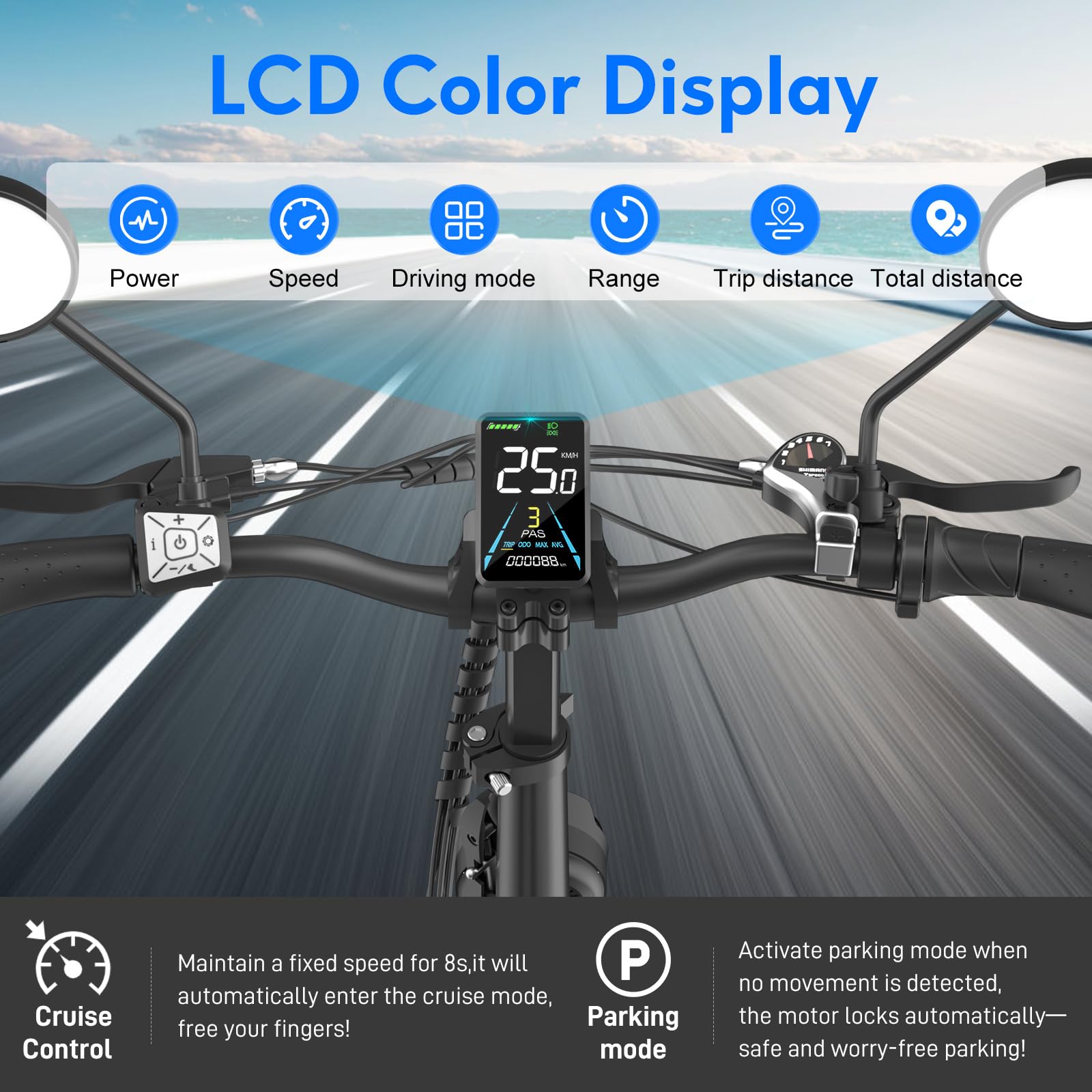 - 【Intelligente LCD-Anzeige mit Tempomat】Farbdisplay zeigt Geschwindigkeit, Reichweite und Fahrmodus. Tempomat per Langdrücken aktivieren – entspanntes Fahren ohne Gashebel.