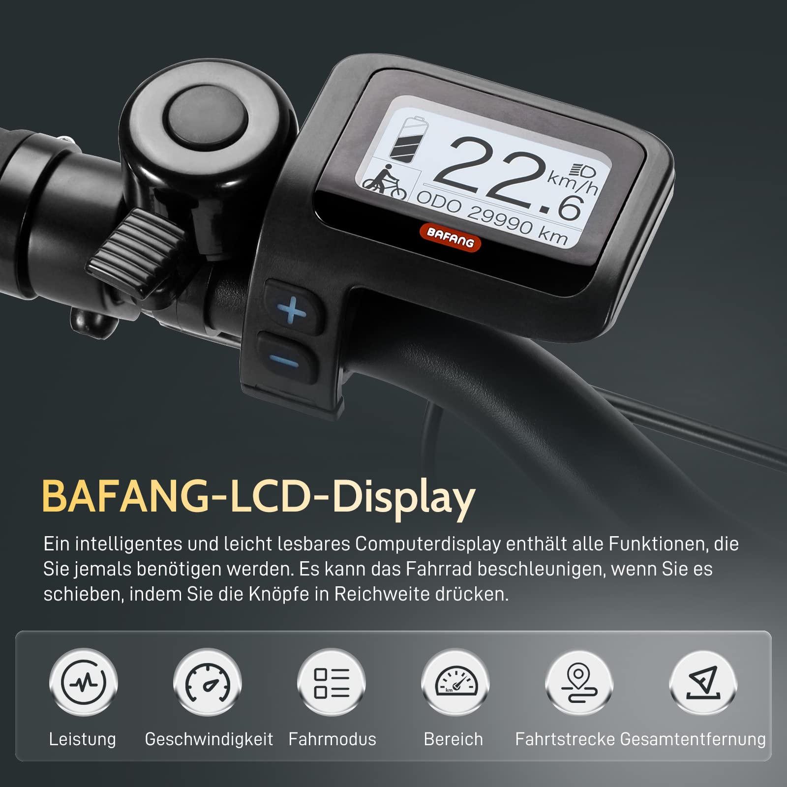 - 【BAFANG LCD Display】Perfekt auf den Motor abgestimmt, verrät das kontrastreiche LCD-Display BAFANG alle relevanten Informationen zu Ihrer Fahrt. Die Benutzeroberfläche ist gut lesbar und intuitiv zu bedienen und kann auch bei direkter Sonneneinstrahlung problemlos gelesen werden. Der zusätzliche Ausgang kann individuell über fünf Unterstützungsstufen gesteuert werden. Es entspricht der Schutzklasse IP 65.