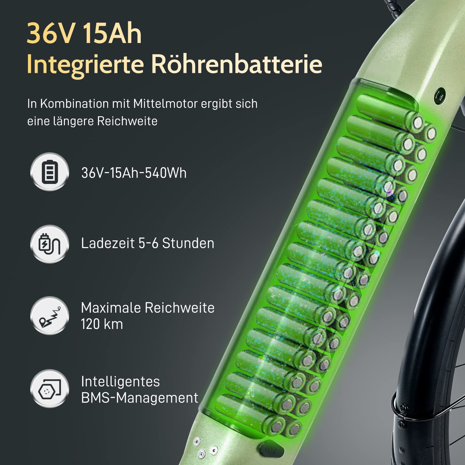 - 【15Ah integrierte Rohrbatterie】Front Integrierte abnehmbare und abschließbare Rohrbatterie Einfach zu laden, einfach zu sichern. Mit Hilfe des maximalen Wirkungsgrades des Mittelmotors erweitert er Ihre Reichweite auf 120km mit einer einzigen Ladung. Das integrierte Batteriedesign gibt Ihnen Stil und Leistung, ohne auf Komfort zu verzichten, wenn Sie durch die Stadt fahren.