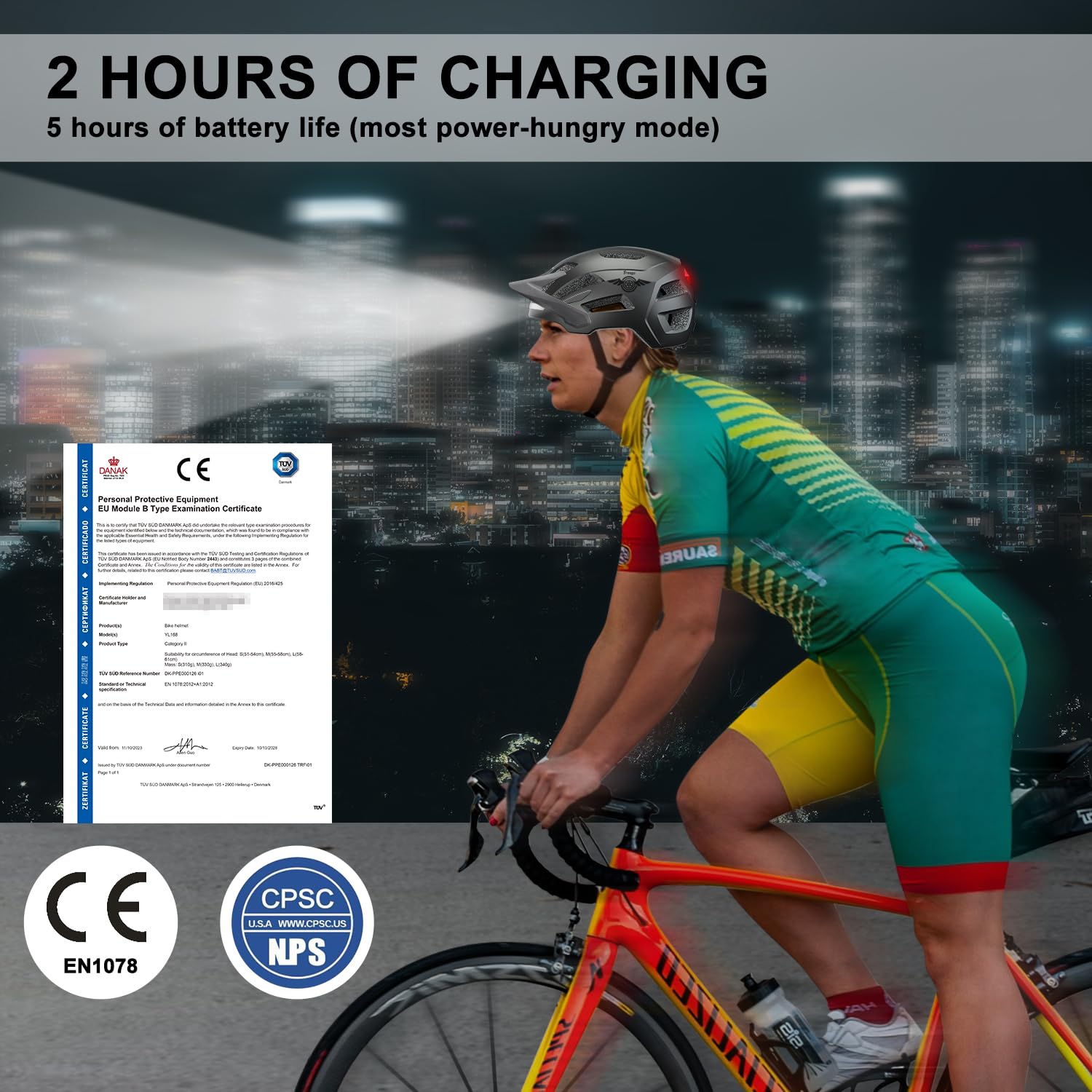 Fahrradhelm für Erwachsene mit wiederaufladbaren USB-LED-Front- und Rücklichtern, Mountainbike- und Rennradhelm für Männer und Frauen mit Verstellbarer Hutkrempe (Black, L)