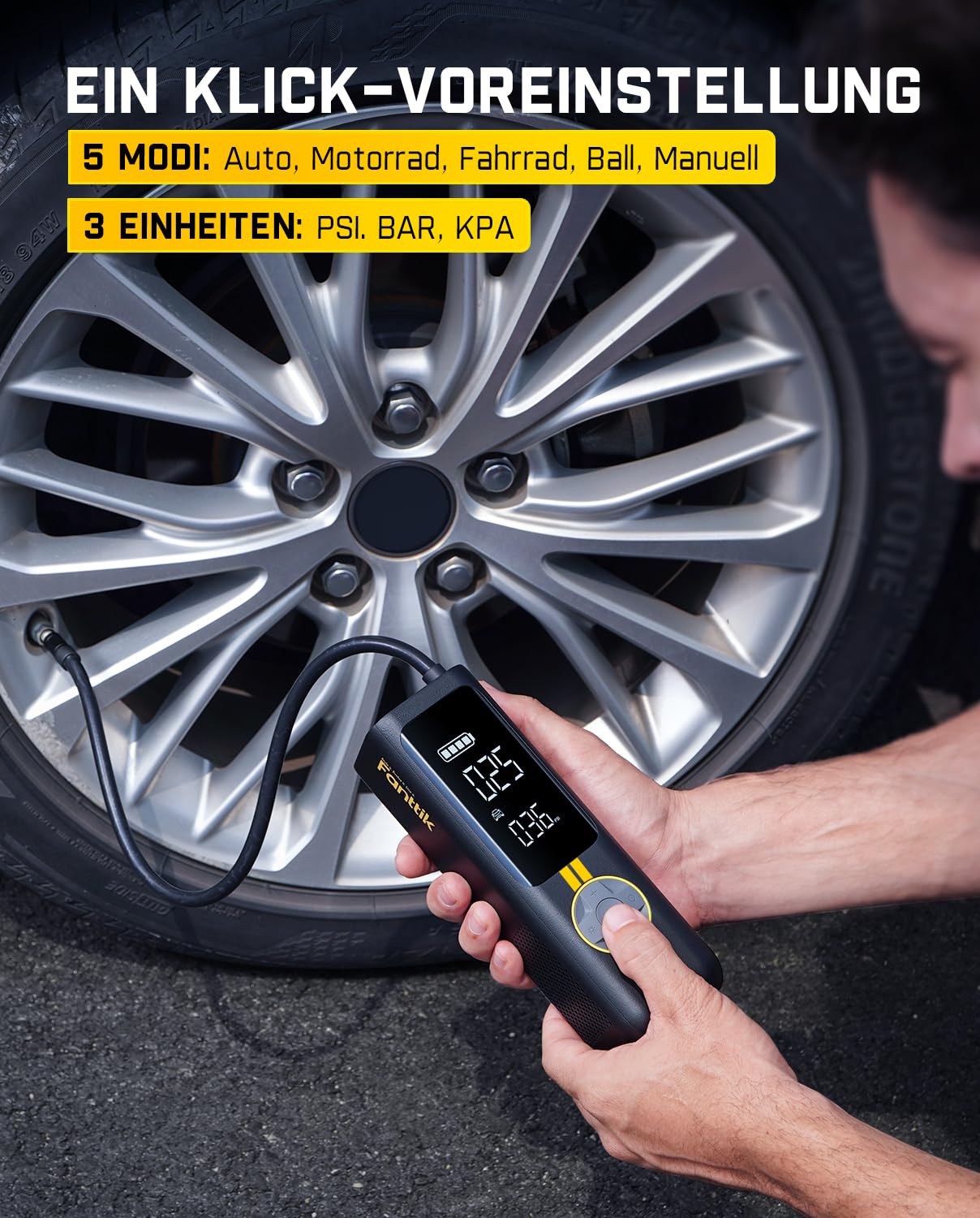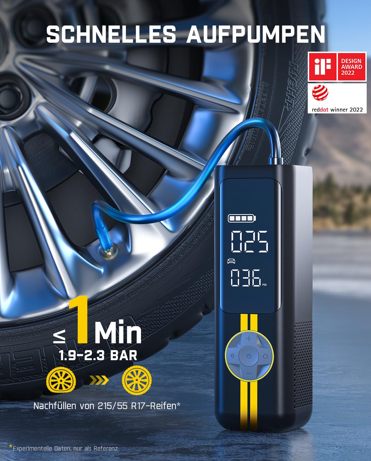 - 56 Sekunden Schneller Inflator:Die schnellste wiederaufladbare 11,1 V Akku-Luftpumpe auf dem Markt. Das Aufpumpen von 26,3 Zoll Reifen des mittelgroßen Autos dauert nur 56 Sekunden(Drücke lange auf die Umrechnungstaste rechts, um die Einheit zu ändern). Das Aufblasen erfolgt punktgenau mit einer Aufblasgenauigkeit von ±0.1 BAR
