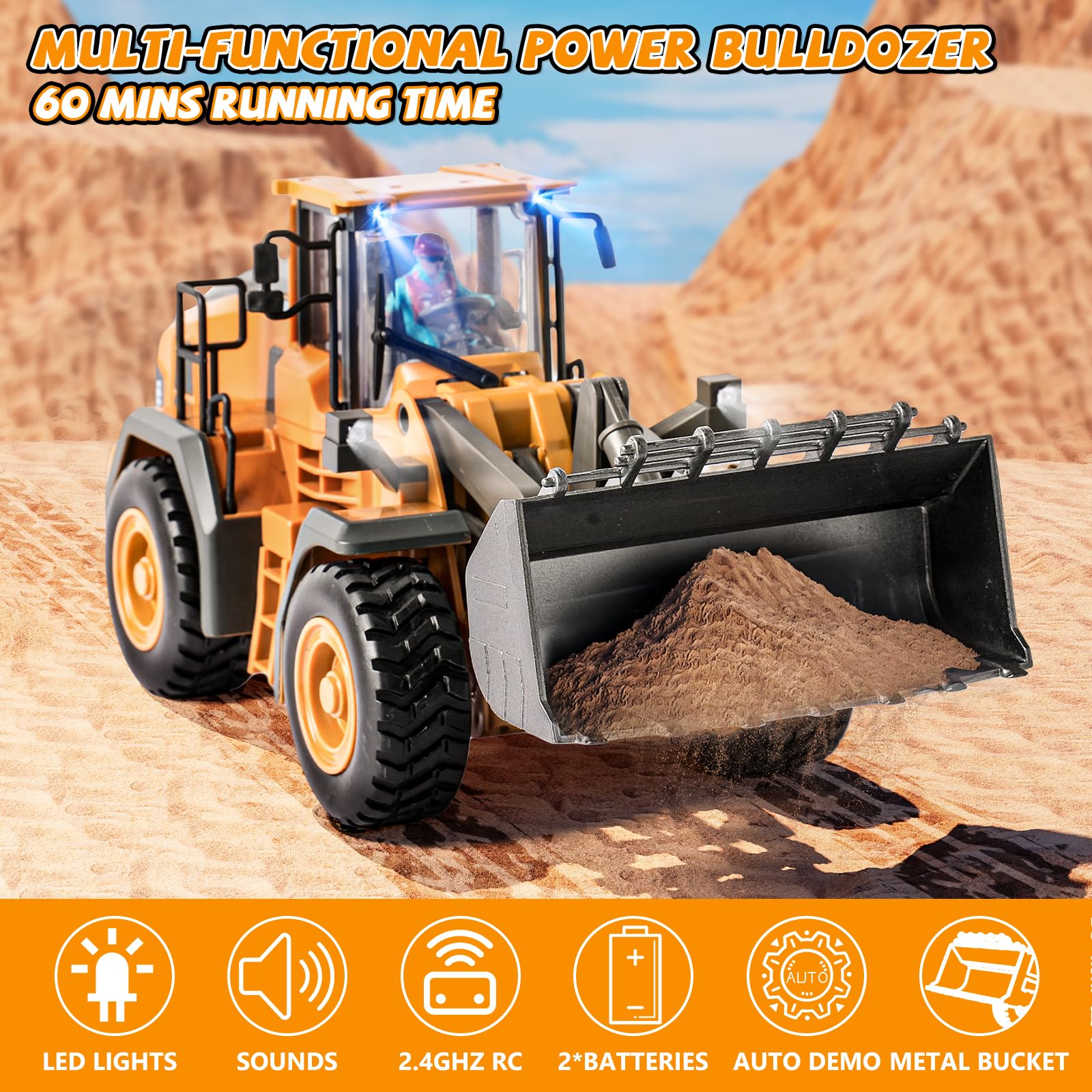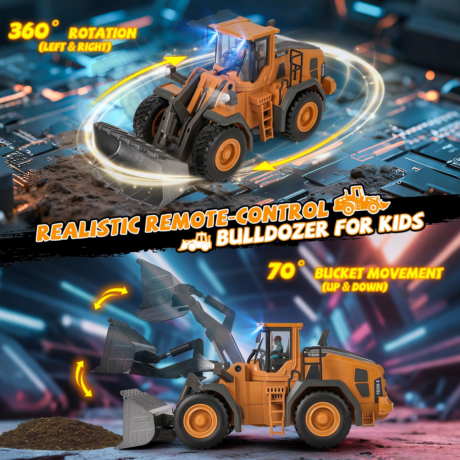 - 【Intelligente RC Radlader Spielzeug】Bulldozer spielzeug mit 2,4-GHz-Funkfernsteuerung (30m Reichweite). Doppel-Joystick steuert separat Fahrbewegung, 360°-Kabinenrotation sowie dreistufigen Gelenkarm (Haupt-/Unterarm, Schaufel). Realistisch nachgebildete Bewegungen wie Laden/Wenden/Entladen, kombiniert mit Motorensound und LED-Lichtern für immersive Spielerfahrung. Ein-Knopf-Demomodus vereinfacht Bedienung für Kleinkinder, während Fortgeschrittene komplexe Manöver ausführen können. (Hinweis: 2x AA-Batterien für Fernbedienung nicht inklusive).