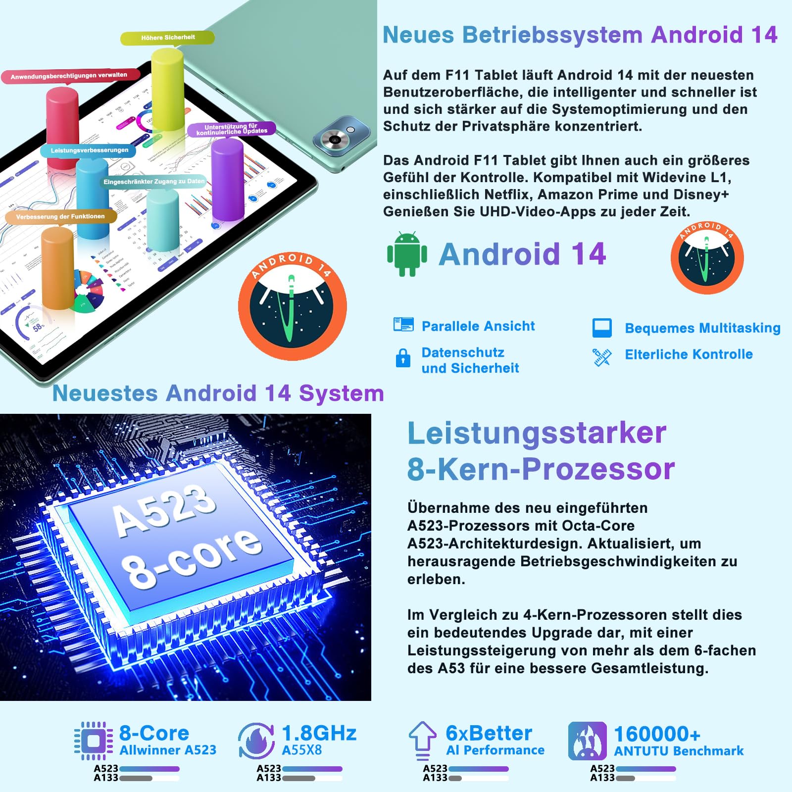 - 【Neustes Android 14 + Octa-Core-Prozessor】Das F11-Tablet ist mit dem neuesten Android 14-System und einer Prozessorgeschwindigkeit von 1.8GHZ ausgestattet. Die hohe Leistung ermöglicht es dem Tablet, mit hoher Geschwindigkeit zu laufen, sodass Sie reibungslos arbeiten und spielen können.