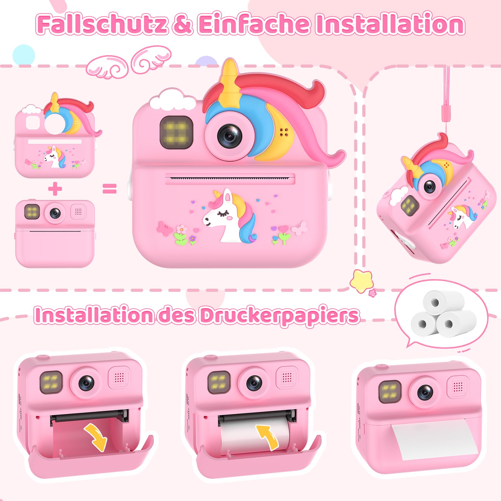 Fippesax Sofortbildkamera Kinder, 1080P HD Kinderkamera mit 32-GB-Karte, 48MP Selfie Kinderkamera Sofortbildkamera, Kinderspielzeug Einhorn Geschenke für Mädchen & Jungen von 3-12 Jahren