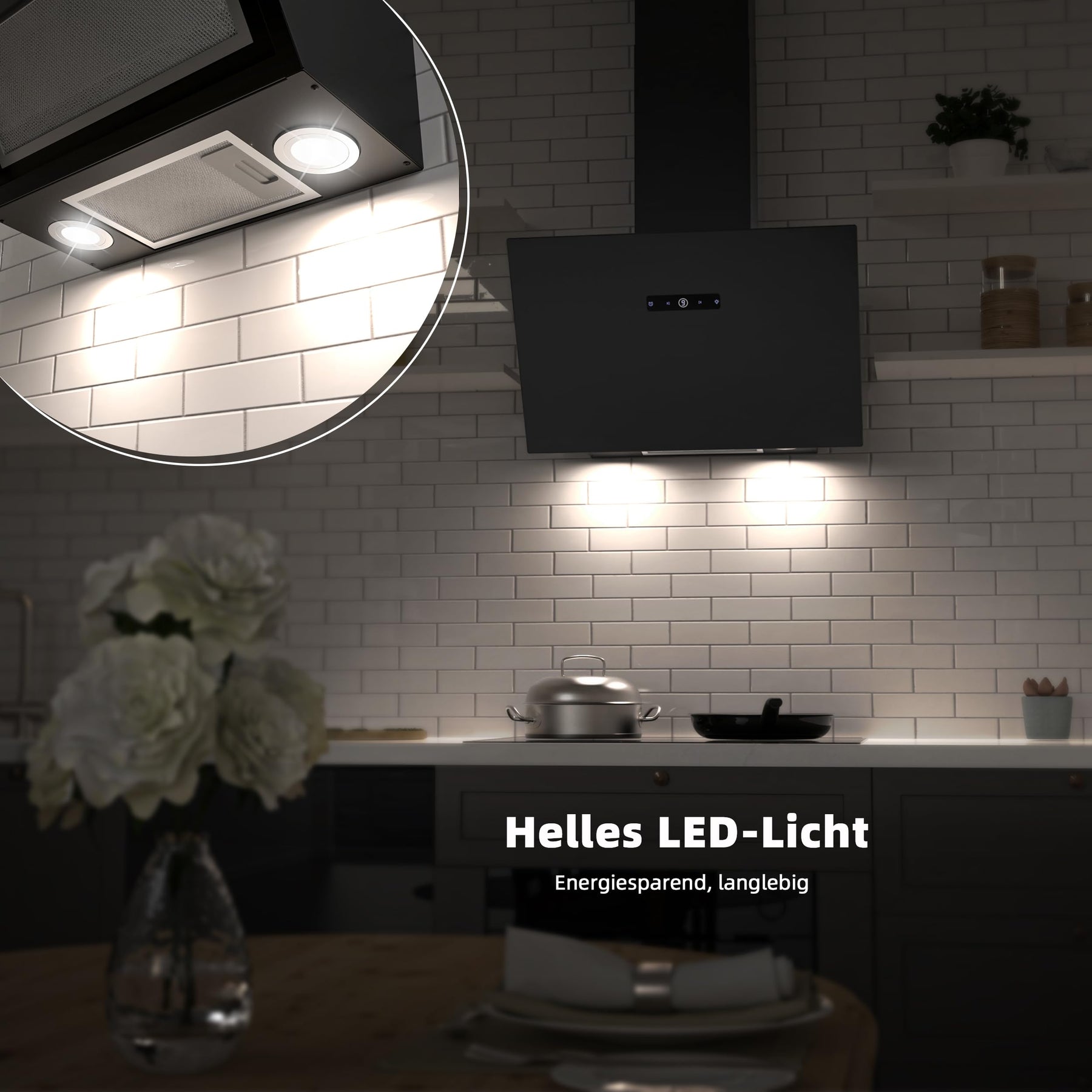 - 9 LEISTUNGSSTUFEN - Für unterschiedlich starke Kochaktivitäten kann die Haube mit neun unterschiedlichen Leistungsstufen betrieben werden.Es ist sehr leise mit einem Mindestgeräusch von 38 dB.