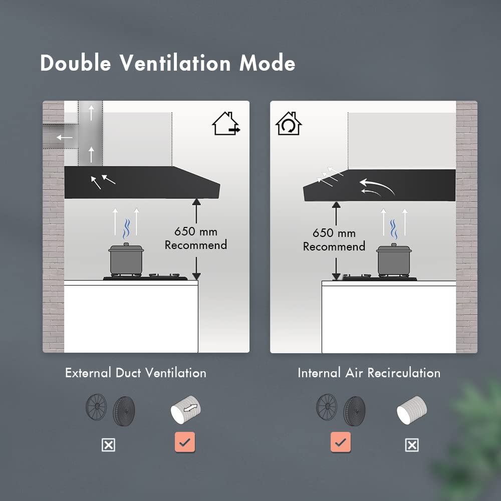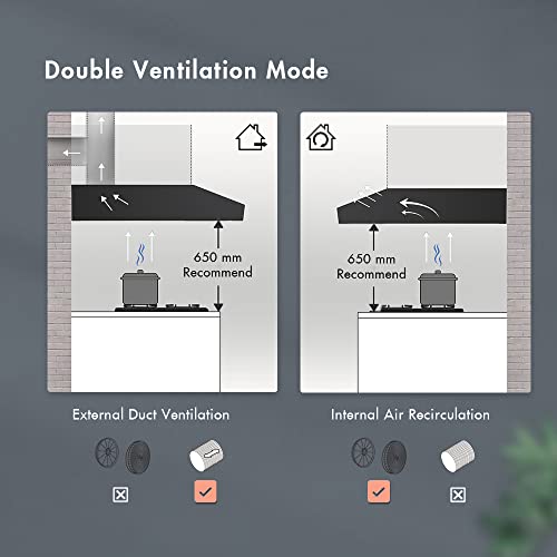 • ABLUFTSYSTEM: Die Haube ist für den Umluft- und Abluftbetrieb geeignet und einfach je nach Bedarf umzustellen.Sie kann durch den Kanalauslass der Dunstabzugshaube oder den Umluftbetrieb mit einem Aktivkohlefilter belüftet werden,der Frischluft in die Küche blasen kann. (Paket beinhaltet: CC130 Aktivkohle*1)