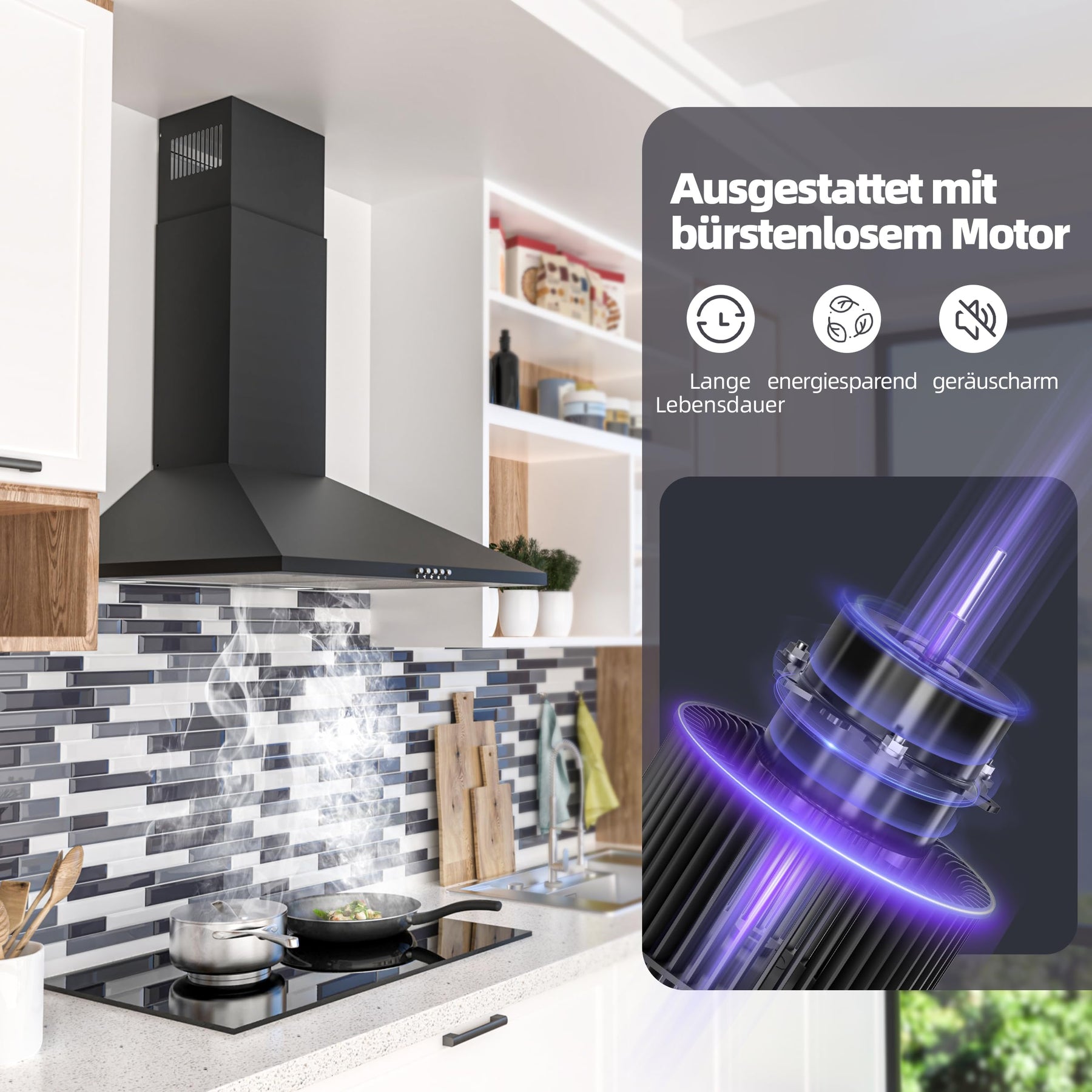 • BÜRSTENLOSER MOTOR: Diese Dunstabzugshaube ist mit einem bürstenlosen Motor ausgestattet, der einen höheren Wirkungsgrad, eine längere Lebensdauer, einen geringeren Geräuschpegel und einen niedrigeren Energieverbrauch als herkömmliche Motoren aufweist und sogar die beeindruckende Energieklasse A++ besitzt.