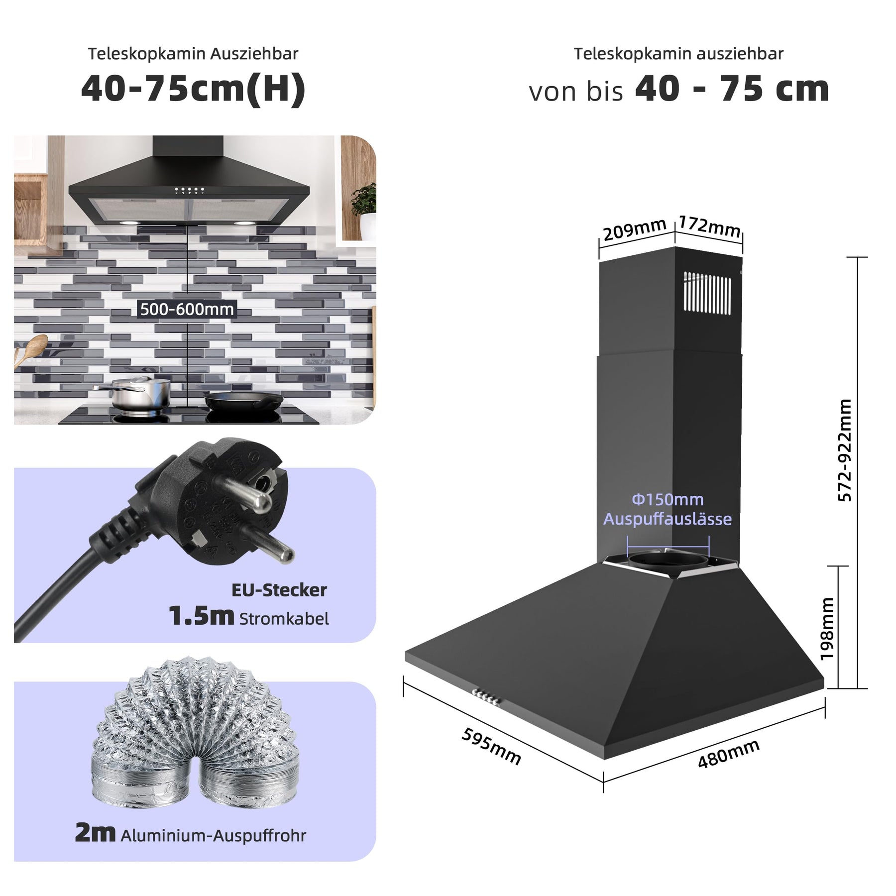 • VERSTELLBARER KAMIN: Der Schornstein kann in der Höhe erweitert und an eine höhere Decke angepasst werden. Es kann flexibel in verschiedenen Küchen installiert werden, Jeder Schornstein Größe: (H) 40cm x (B) 20,9cm x (T) 17,2cm.