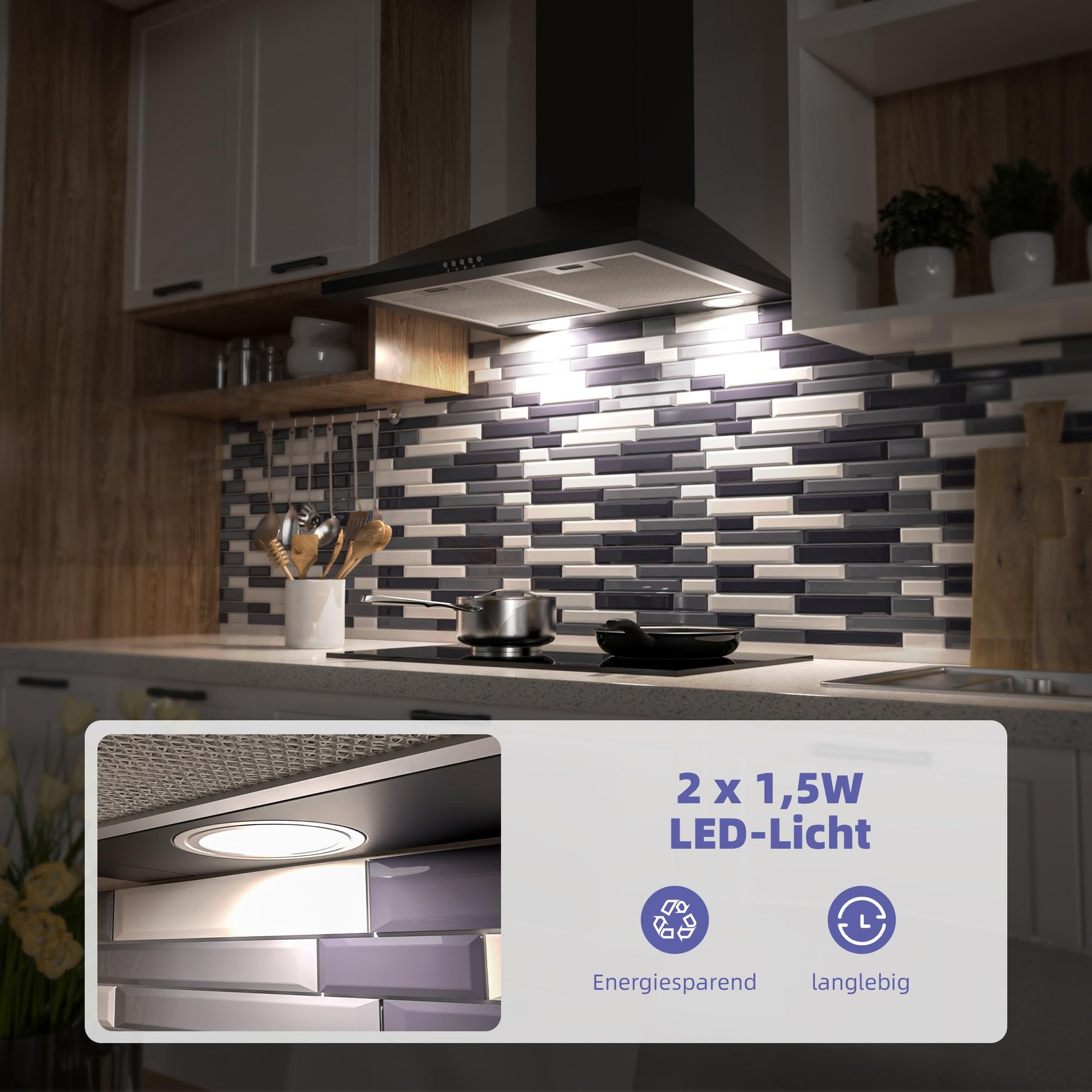 • 2*1,5W LEDs: Die Haube verfügt über 2 LED-Leuchten, die schön hell und warm sind, großartig für ein gewisses Ambiente, noch besser, um genau zu sehen, was Sie am Herd tun.