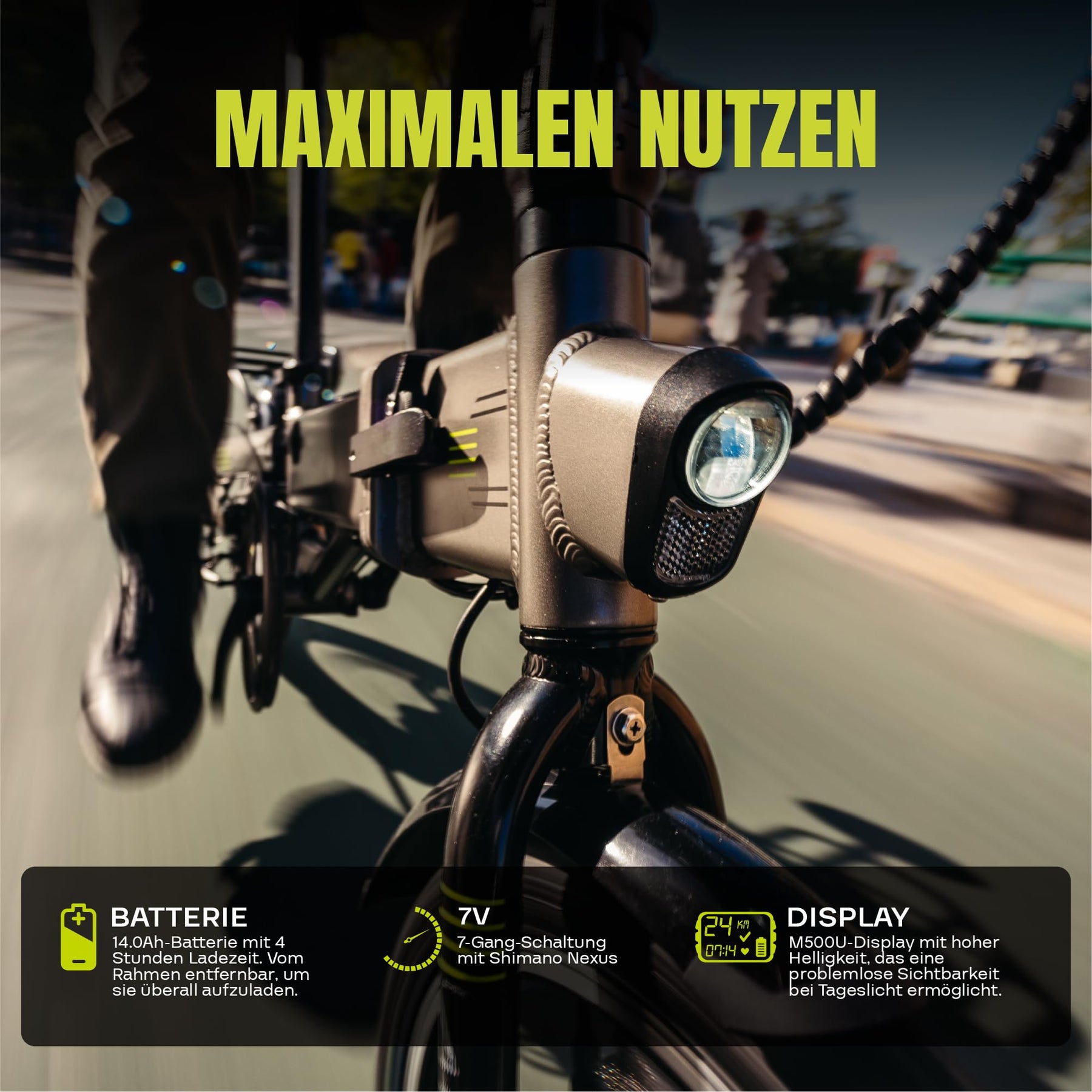 Drei Fahrmodi und 7 Gänge Genieße drei Modi: Voll elektrisch, Pedalunterstützung und manuelles Pedalieren. Passe die Intensität deiner Unterstützung je nach Bedarf an. Mit der Nexus 7-Gang-Schaltung wird das Fahren auf Steigungen erleichtert, und du kannst dein Fahrerlebnis auf allen Arten von Gelände anpassen.