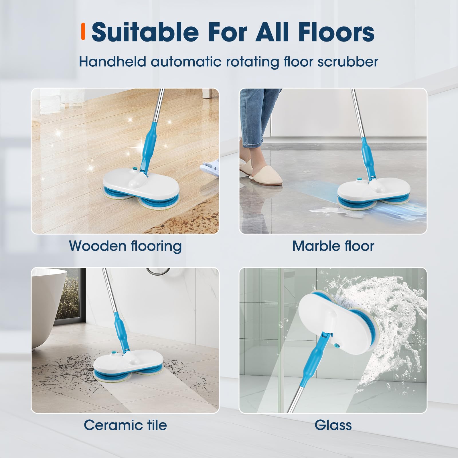 - 【Vielseitig einsetzbar】Unser elektrischer Wischmopp kann auf Holzböden, Fliesen, Glas und anderen Oberflächen verwendet werden und deckt somit die meisten gängigen Baumaterialien ab, um den Bedürfnissen verschiedener Haushalte gerecht zu werden.