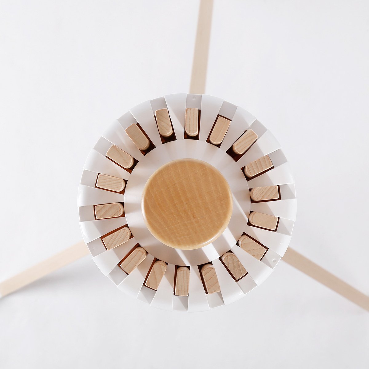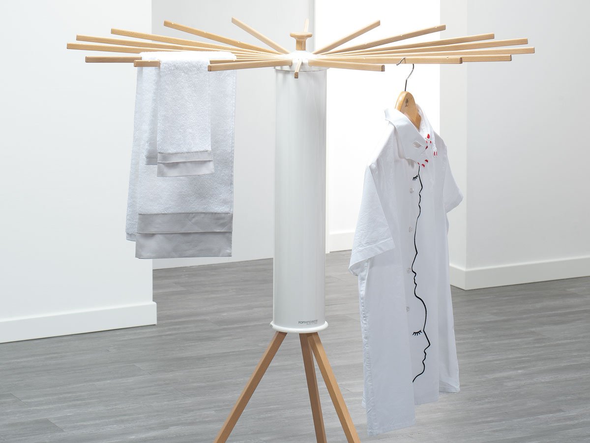 Einzelheiten: Radialer Trockenständer mit 18 abnehmbaren und unabhängigen Speichen aus massivem Buchenholz. Struktur aus PVC-beschichtetem Buchenholz. Im geschlossenen Zustand nimmt es sehr wenig Platz ein.