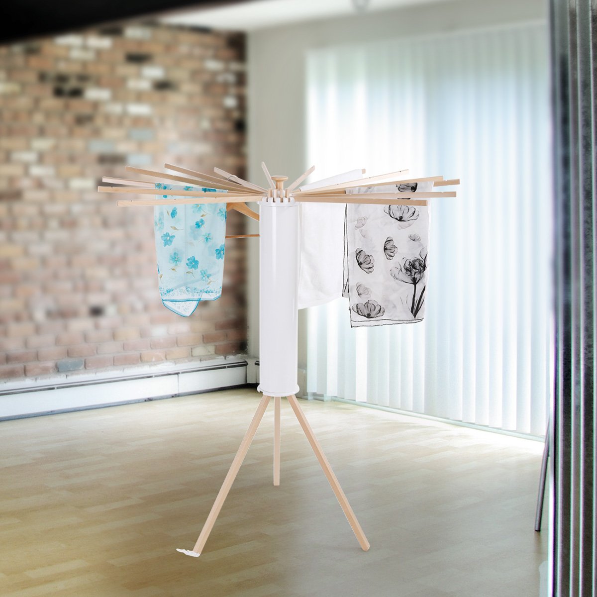 - Der radiale Wäscheständer hat 18 unabhängig herausziehbare Strahlen aus massivem naturlackiertem Buchenholz.