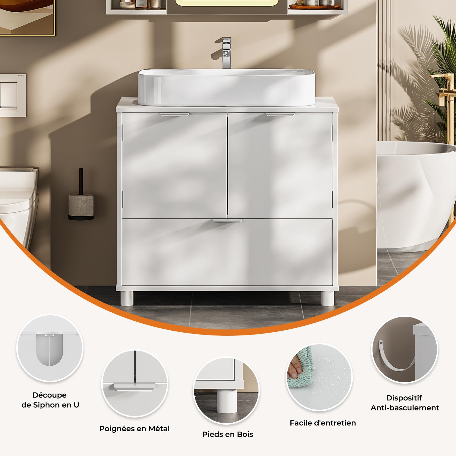 • 【Moderne Optik】 Mit seiner klassisch weißen Oberfläche, dem minimalistischen Design und den schicken Griffen verleiht der Waschtischunterschrank Ihrem Badezimmer einen schlichten Touch und lässt sich leicht mit anderen Möbeln kombinieren. Darüber hinaus kann der Unterschrank unansehnliche Abflussrohre verbergen und Sauberkeit in Ihrem Bad bringen