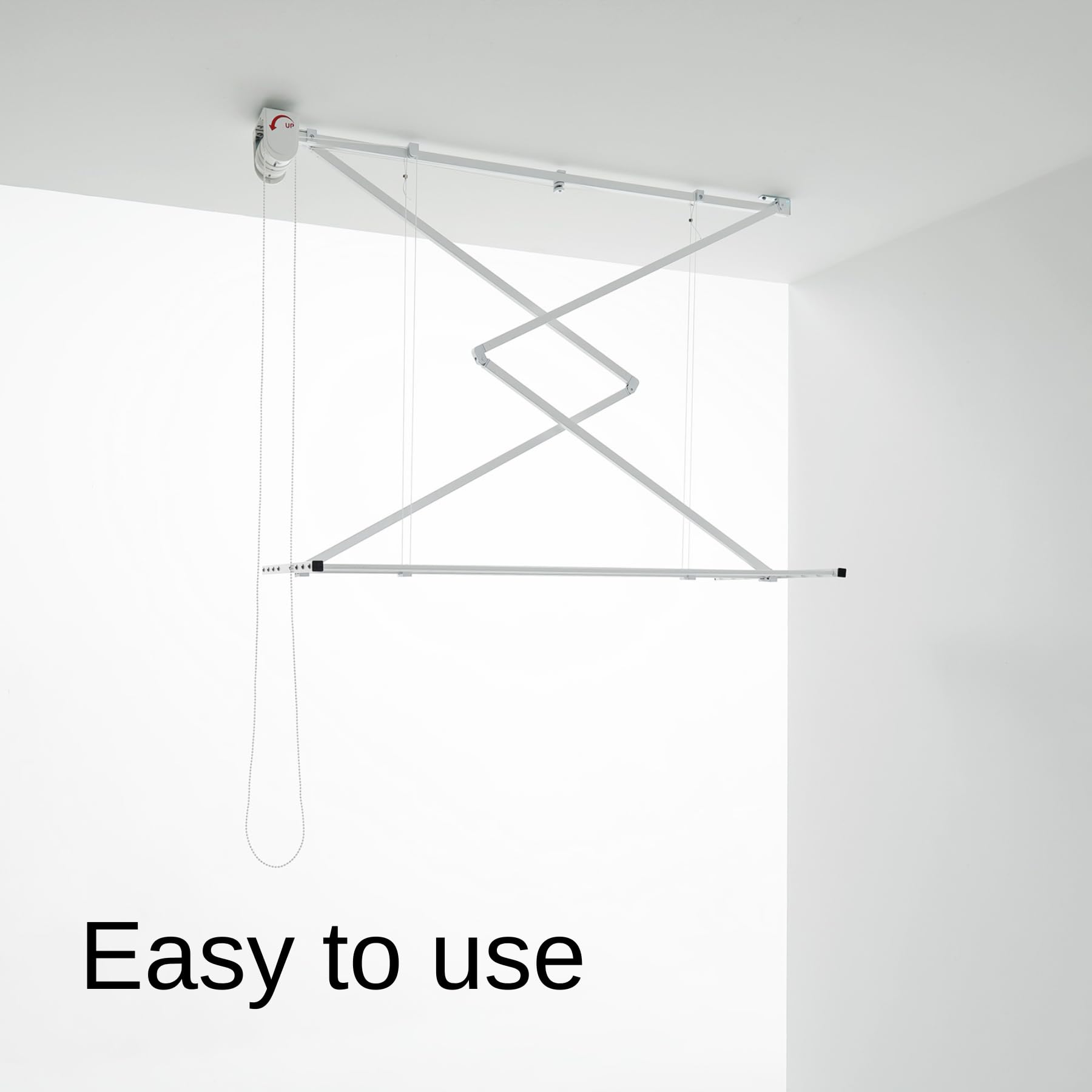 • ▶️ 【Leichter Lift】: Der Wäschetrockner Foxydry Mini ist mit einem speziell entwickelten Kettenmechanismus ausgestattet, um die Wäsche mit minimalem Aufwand zu heben und abzusenken. Das Gestell kann auf jeder gewünschten Höhe bis zu 180 cm von der Decke angehalten werden, sodass Sie die für Sie angenehmste Höhe zum Beladen der Wäsche wählen können.