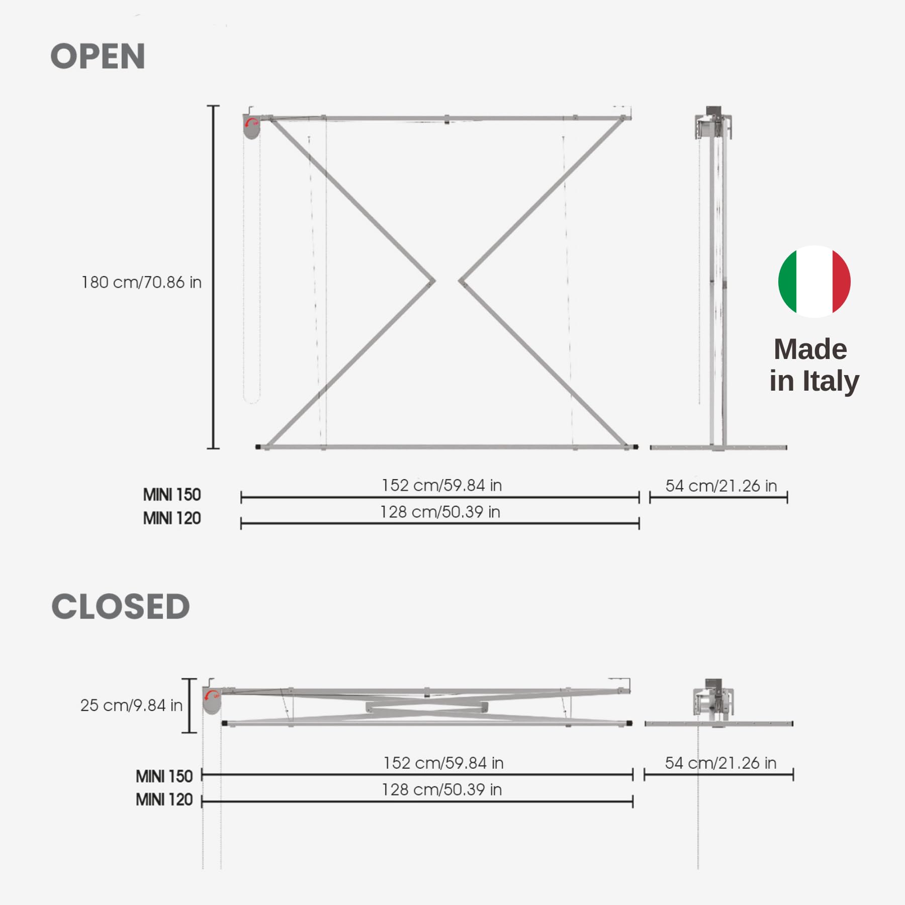 Foxydry Mini Deckenständer, vertikaler Wäscheständer, zusammenklappbar in Aluminium und Stahl 152x54x25 cm