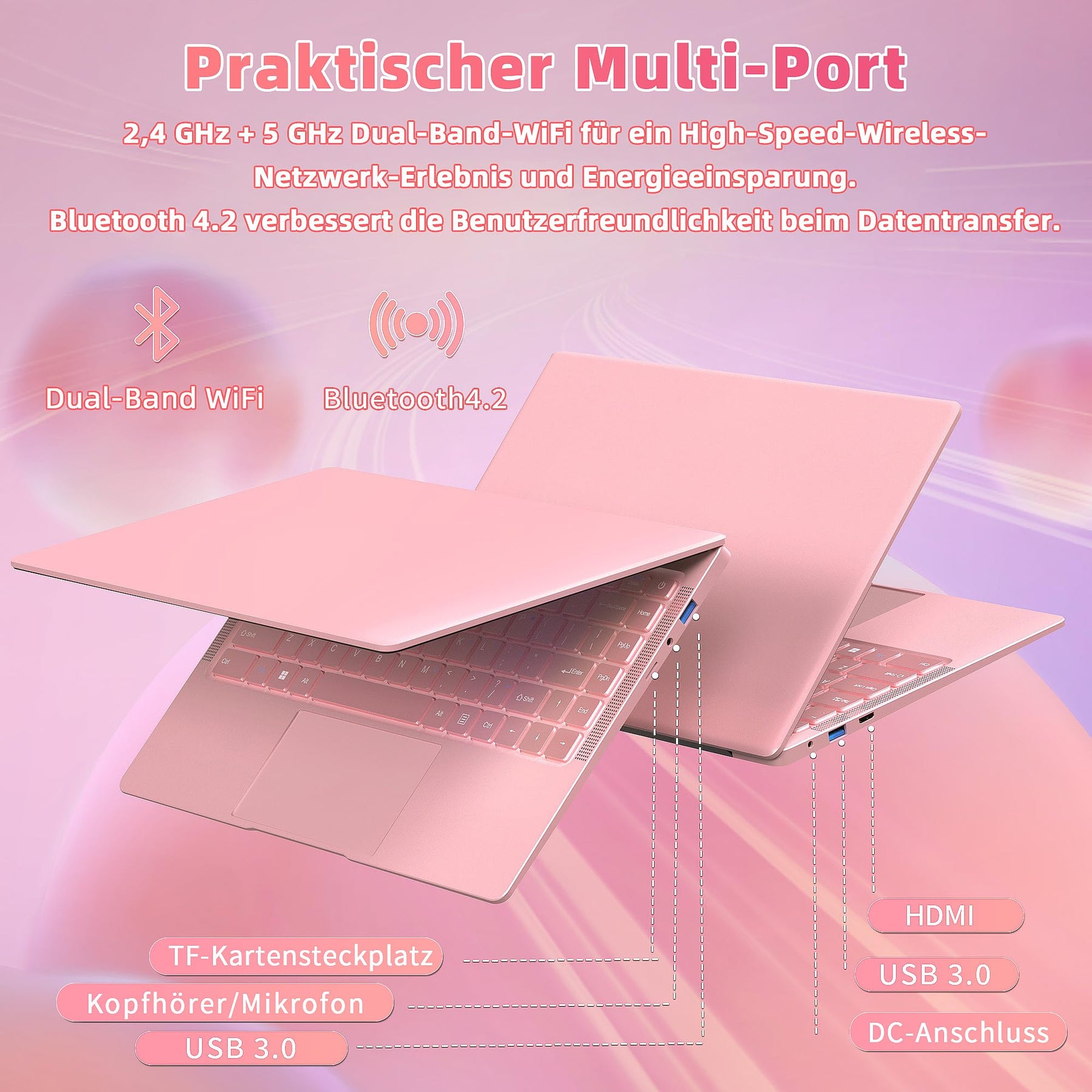 - 【Elegantes Design & Portabilität】 Der Fsjun 14 Zoll Laptop überzeugt mit einem schicken Roségold-Design und einem ultra-dünnen Gehäuse von nur 8 mm Dicke und einem Gewicht von 1,25 kg. Perfekt für unterwegs – ob im Büro, auf Reisen oder im Café. Dank seiner kompakten Bauweise passt er problemlos in jede Handtasche oder Aktentasche. Ein stilvolles und praktisches Gerät für alle, die Mobilität und Design schätzen