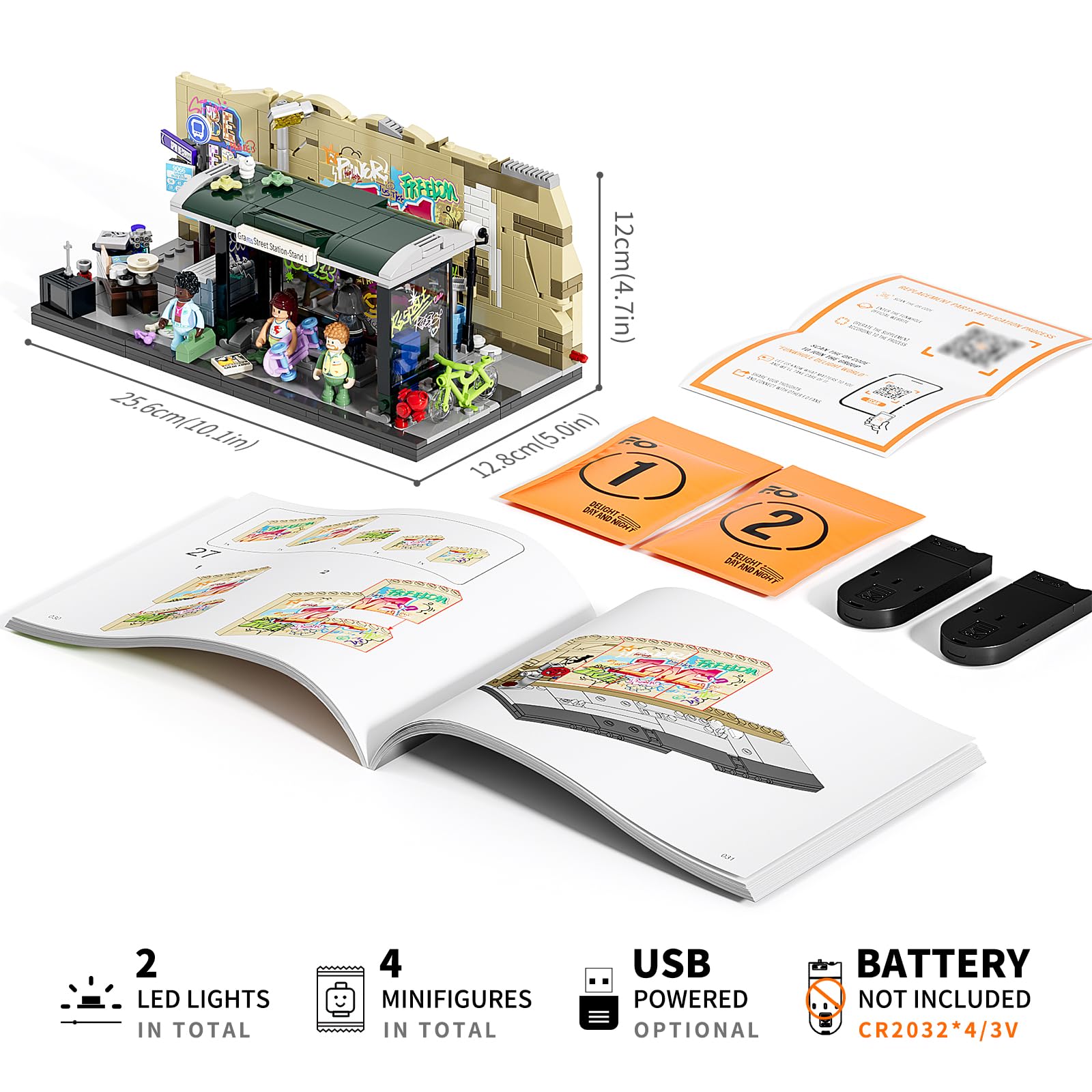 FUNWHOLE Graffiti-Bushaltestelle Klemmbausteine Beleuchtung Deko, Modular Building Straßenfusion City Town Busbahnhof,516Pcs,Geeignet für Erwachsene und Streetstyle-Liebhaber,F9066,Bus Stop