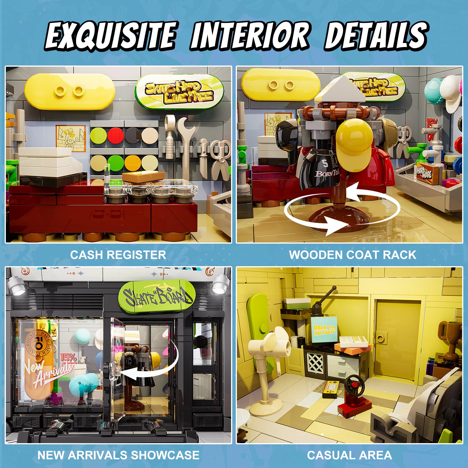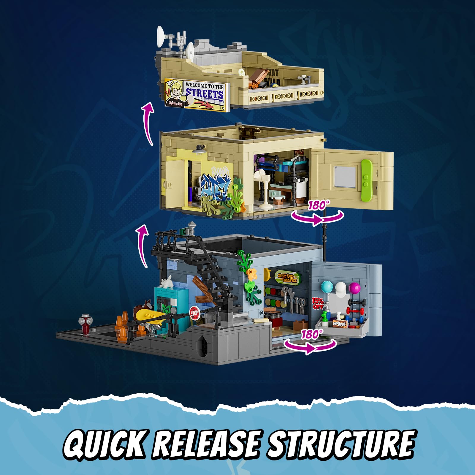 - 【Detailreiche Gestaltung】Der Skate-Shop ist ein zweieinhalbstöckiges Gebäude. Das Erdgeschoss verfügt über einen Verkaufsbereich mit Skateboard-Zubehör und Graffiti-Werkzeugen; das erste Obergeschoss ist dem Genießen von Hip-Hop-Musik und Videospielen gewidmet; das Dach dient als Grill- und Graffitibereich. Das Set enthält 6 Graffiti-Kunstwerke und 25 farbenfroh bedruckte Steine, die sich auf Straßenkultur beziehen und einen lebendigen Straßenstil schaffen.