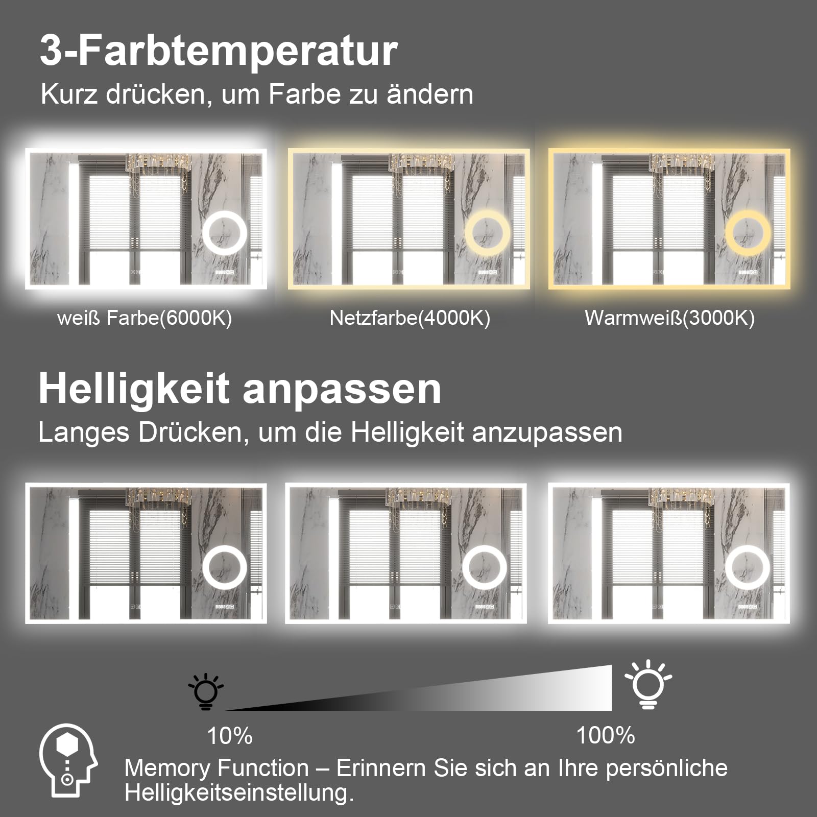- 2.Unser Badezimmer-Kosmetikspiegel mit effizienten und energiesparenden Doppel-LED-Lichtleisten, die langlebig sind und keine Wartung erfordern. Berühren Sie den Schalter, um die Helligkeit (10 % - 100 %) entsprechend Ihren Bedürfnissen anzupassen. Sie können zwischen drei Beleuchtungsarten wählen (kalt, neutral und warm). Wählen Sie Ihre Lieblingsbeleuchtung, um einen perfekten Look zu kreieren.