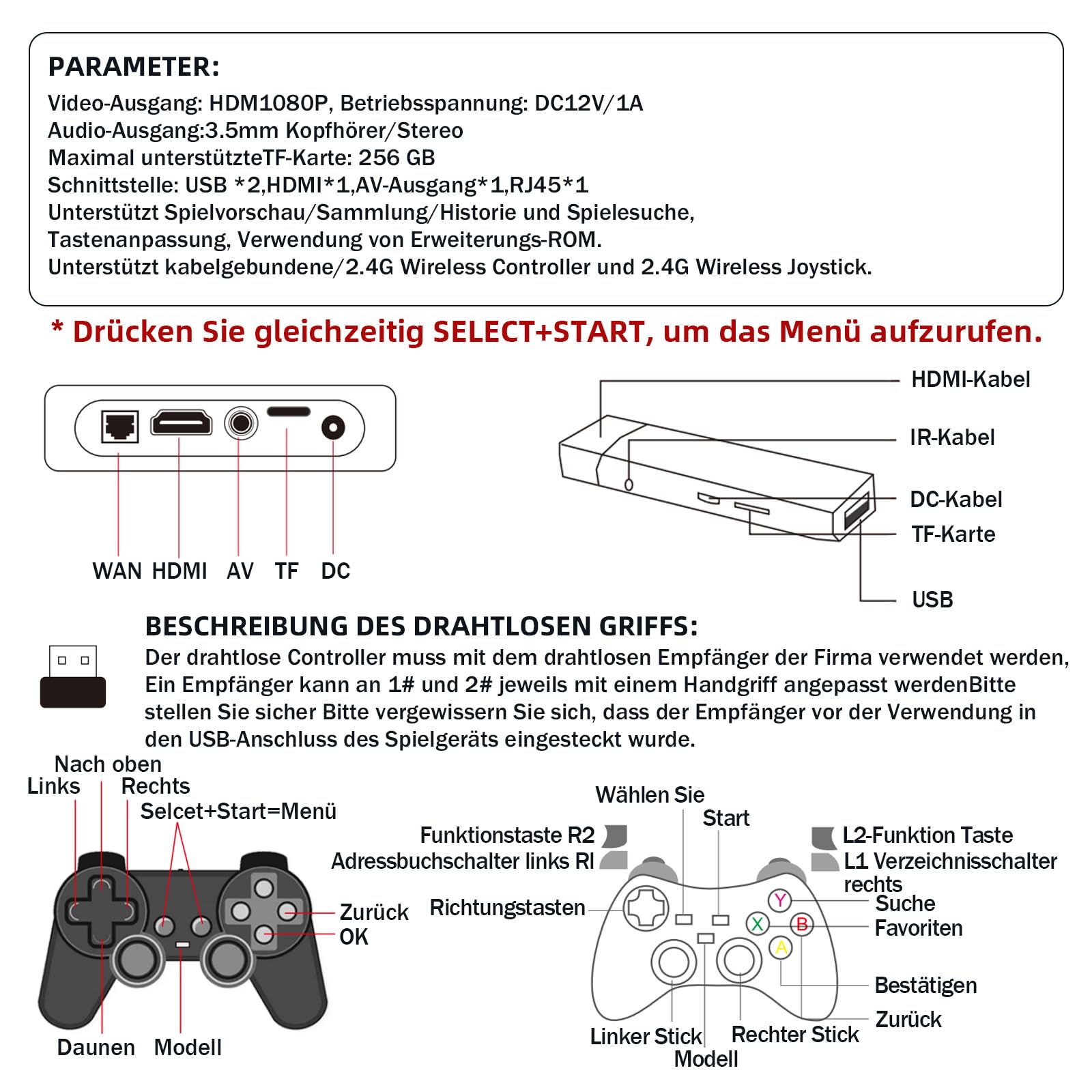- EINFACHE O-PERATION: 1. Die TF-Karte einlegen. 2. Schließen Sie den USB-Empfänger an. 3.stecken Sie das Netzkabel ein. 4. Schließen Sie das USB-Netzteil an. 5. Drücken Sie die Power-Taste, um die Spielkonsole zu starten. Es besteht keine Notwendigkeit für eine komplexe Installation oder Konfiguration. Es handelt sich um einen benutzerfreundlichen Videospiel-Stick, den jeder mit Leichtigkeit bedienen kann. (Wenn der Controller nicht reagiert: Bitte ziehen Sie den USB-Empfänger ab und stecken Sie ihn wieder ein, schalten Sie den Controller aus und schalten Sie ihn wieder ein, um zu sehen, ob er sich wieder verbinden kann)