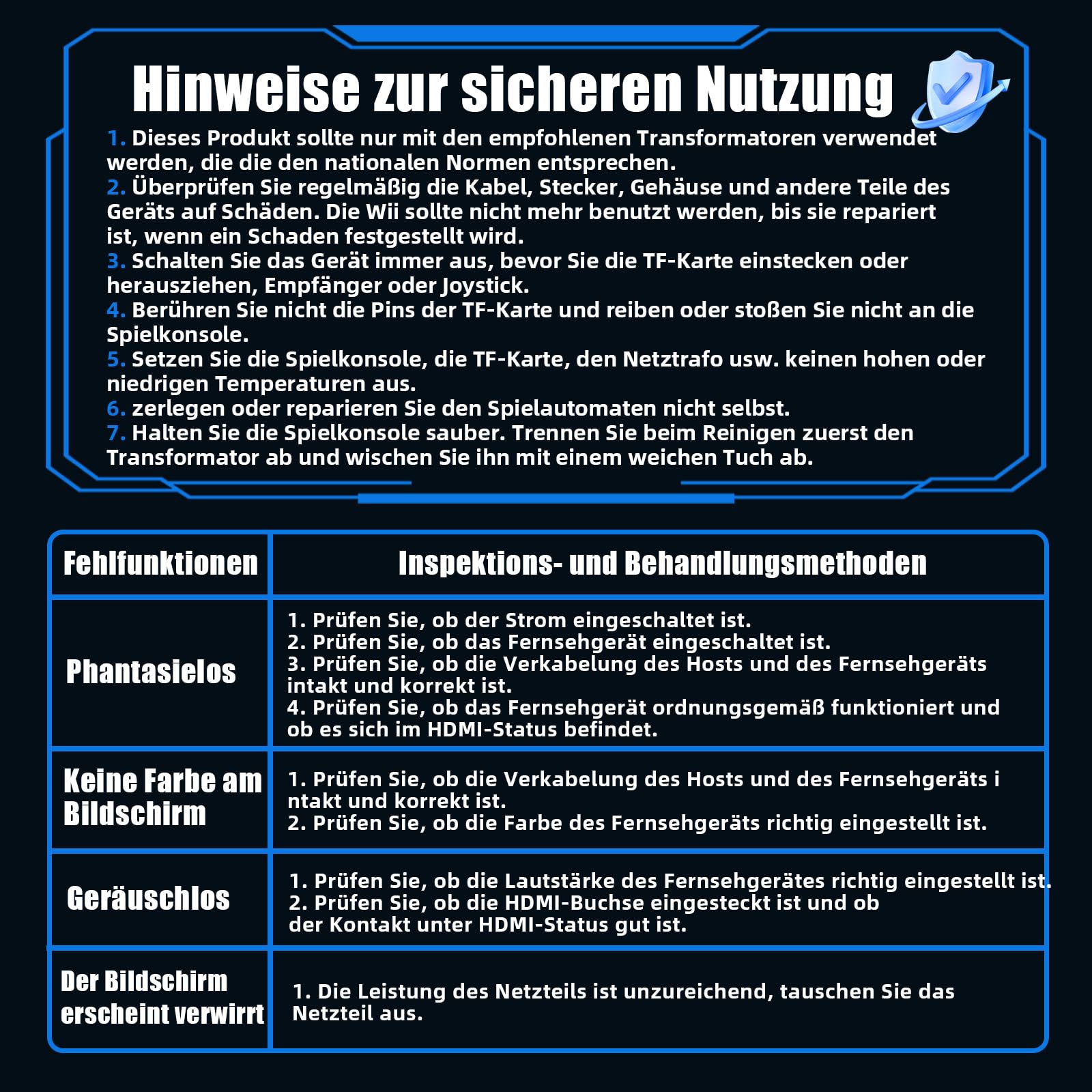 - 【!!HINWEIS】 Die Spielkonsolen unterstützen die Benutzer nicht dabei, das System selbst zu ändern oder zu aktualisieren sowie das System zu aktualisieren. Wenn Sie irgendwelche Probleme während der Verwendung auftreten, können Sie uns jederzeit kontaktieren, und wir werden sie für Sie in der schnellsten Geschwindigkeit lösen