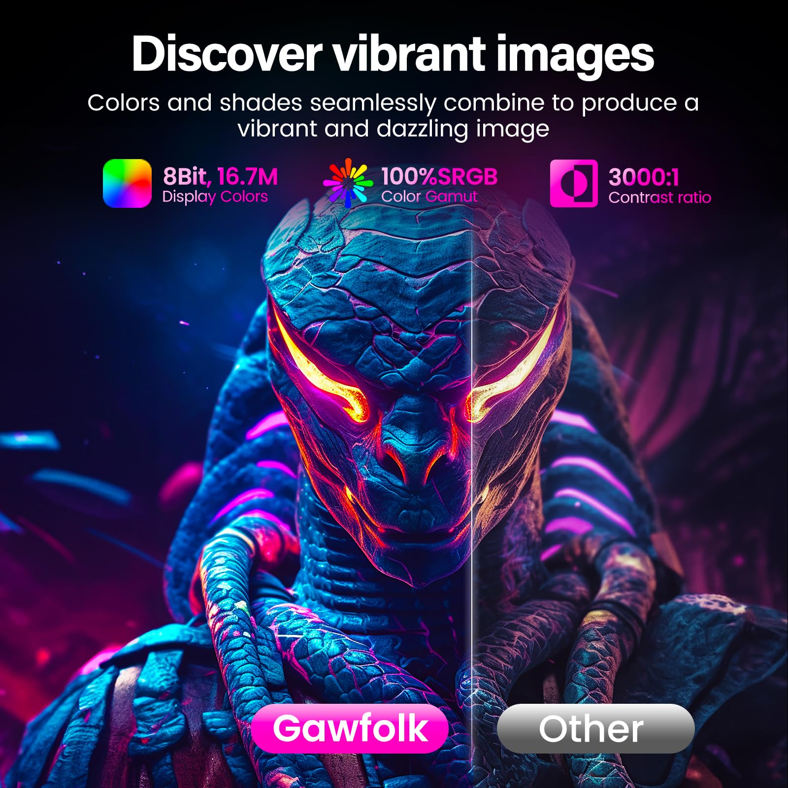 BILDQUALITÄT – Der Gaming Computermonitor bietet ein lebendiges visuelles Erlebnis mit 8-Bit-Farbtiefe, einem umfassenden Farbraum von 16,7 Millionen Farben, einem dynamischen Kontrastverhältnis von 3000:1 und vollständiger Abdeckung des sRGB-Spektrums. Tauchen Sie ein in satte, detailreiche Farben, die Ihr Gaming und Ihre Grafik zum Leben erwecken