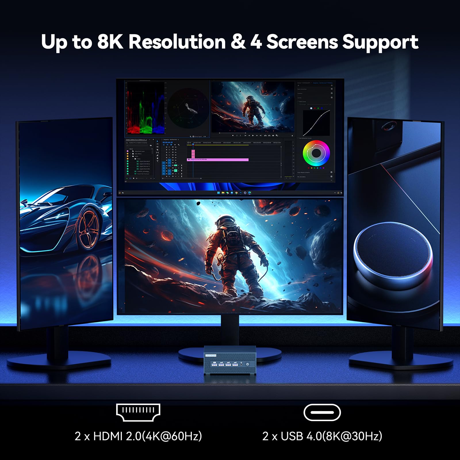 - 【Reiche Schnittstellen & 8K Quad-Display】IT1 Mega mini pc ist mit 2 *USB4.0 Ports((bis zu 40Gbps,8K@30Hz),2*HDMI 2.0 Ports(4K@60Hz),2* RJ45 2500M LAN, so dass es in der Lage ist, zwei 8K Displays und zwei 4K Displays gleichzeitig zu unterstützen (insgesamt vier Monitore). Egal, ob Sie Filme ansehen, Spiele spielen oder Videos bearbeiten, dieser Mini-Computer liefert eine außergewöhnliche Bildqualität, die Sie in ein wirklich fesselndes visuelles Erlebnis eintauchen lässt.