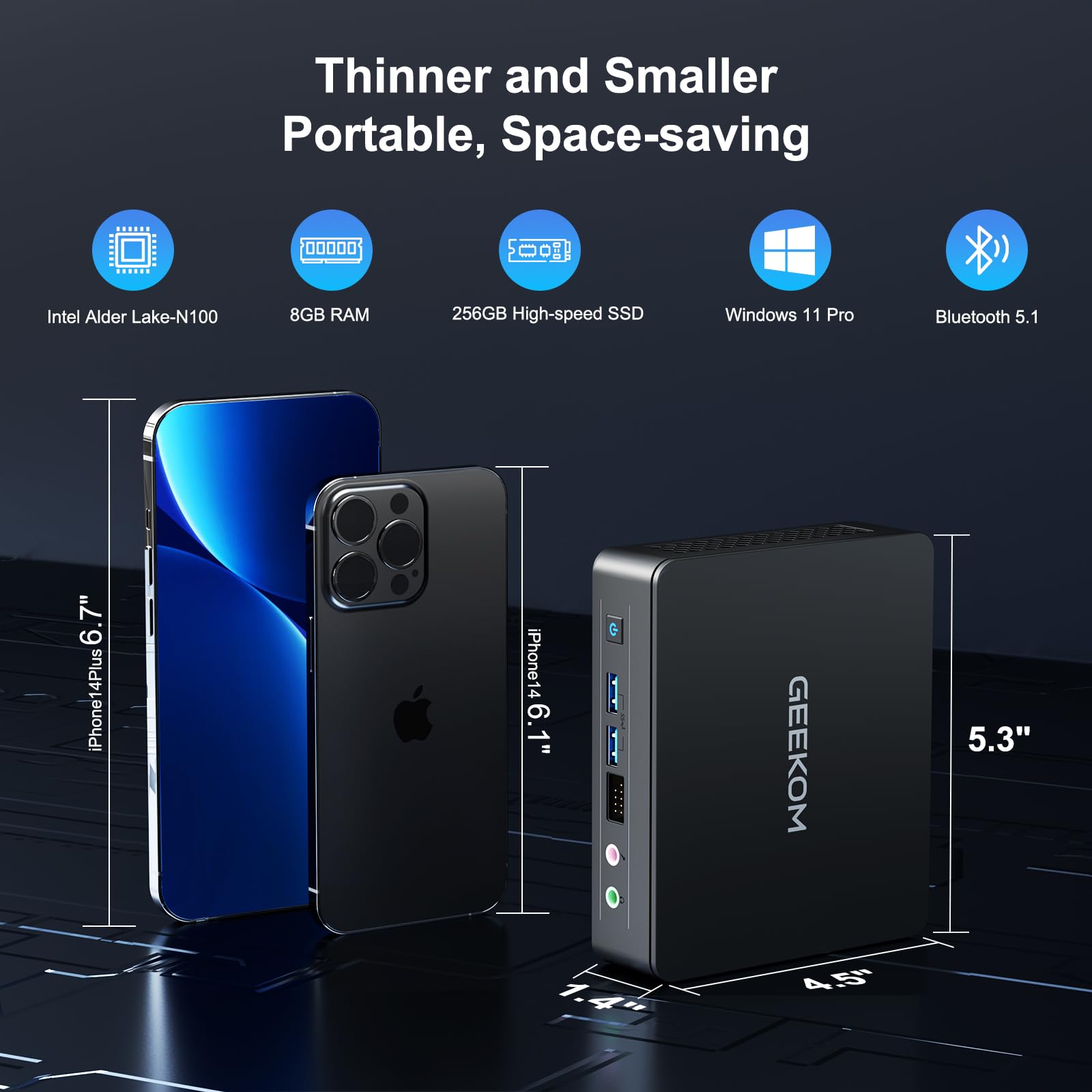 - [Klein aber leistungsstark] Der GEEKOM air12 Lite Mini-PC wird von einem Intel N100-Prozessor angetrieben, der über 4 Kerne und 4 Threads mit 3,40 GHz Turbo verfügt. Er integriert den Intel Gaussian und Neural Accelerator, die Intel Smart Sound-Technologie und Intel High Definition Audio sowie andere fortschrittliche Technologien, die ein reibungsloses Erlebnis bei täglicher Büro- und Heimanwendung gewährleisten. Der Prozessor verfügt über Intel UHD Graphics und unterstützt eine 4K 60Hz-Ausgabe.
