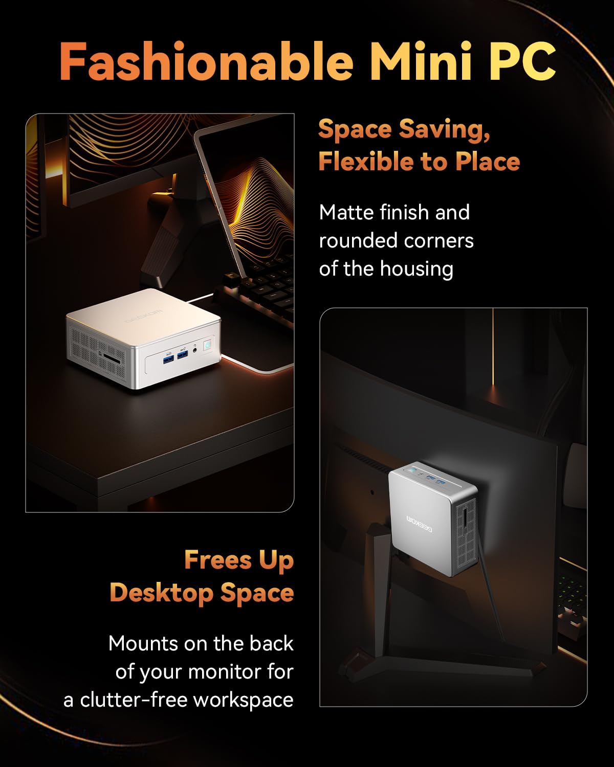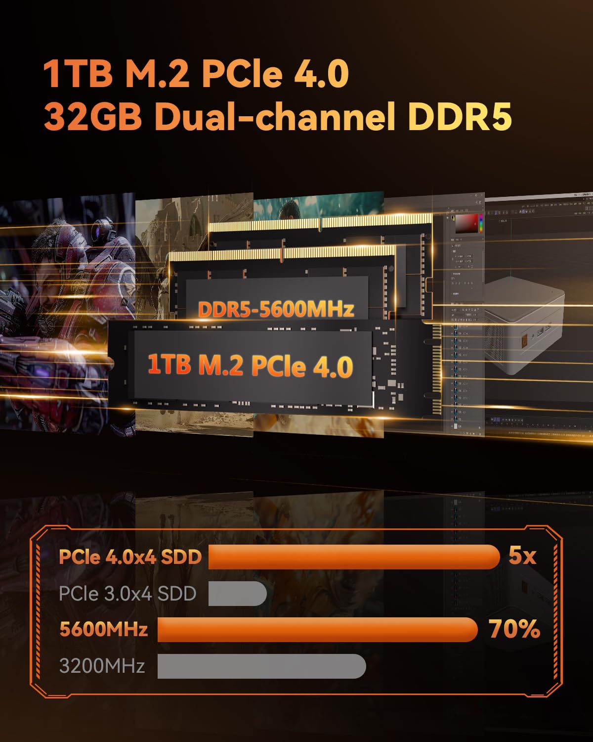 - GROßE UND ERWEITERBARE KAPAZITÄT: AE7 mini computer mit dem 32 GB(erweiterbar auf 64 GB) Dual Channel DDR5 RAM(Speichergeschwindigkeit ist bis zu 5600 MHz) beseitigt Mini PC R9 die Bedenken hinsichtlich unzureichendem Speicher und bietet ein beispielloses Speicherlauf. AE7 Mini server das standardmäßige 1 TB Solid-State-Laufwerk verwendet das PCIE Gen4*4 Protokoll, um Ihnen ein blitzschnelles Lese- und Schreiberlebnis von Daten zu ermöglichen.