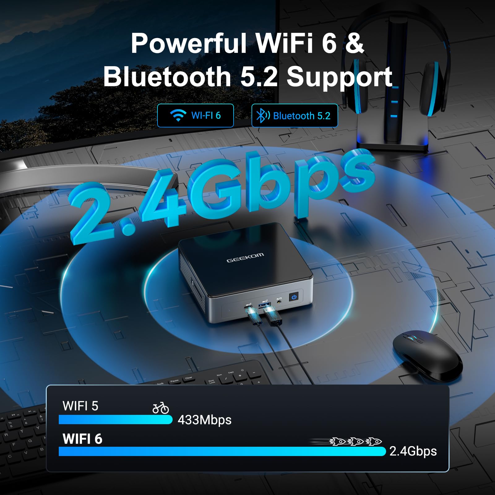 - [Wifi6 & BT5.2] – Der kleine PC GEEKOM Mini Air12 ist mit WiFi6 und BT5.2 ausgestattet, die Ihren täglichen Nutzungsanforderungen gerecht werden und eine schnelle Datenübertragung ermöglichen. Und auch die Ports sind sehr umfangreich, was dafür sorgen kann, dass Sie täglich schnell verschiedene Bürosoftware ausführen können und Ihr Büro und Ihr tägliches Lernen effizient erledigen können.