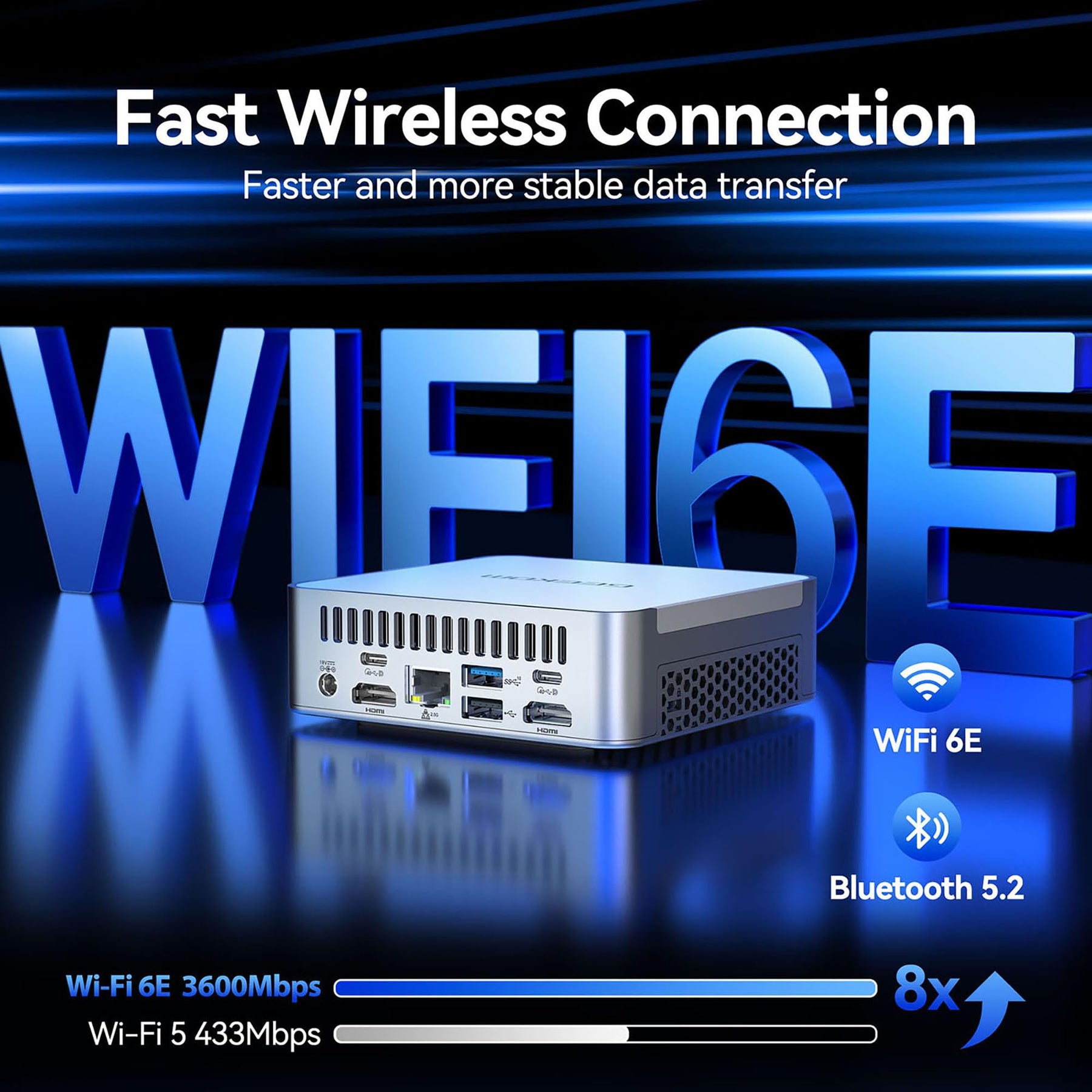 - SOFORT EINSATZBEREIT– Der Mini gaming PC verfügt über einem 2,5-Gbit/s-Ethernet-Anschluss und WiFi 6E für schnelle und zuverlässige Netzwerkverbindungen, sowohl kabelgebunden als auch kabellos. So können Sie Online-Gaming, 8K-Online-Videos und Echtzeit-VR ohne Verzögerung genießen. Mit dem vorinstallierten, originalen Windows 11-Betriebssystem ist er sofort einsatzbereit.