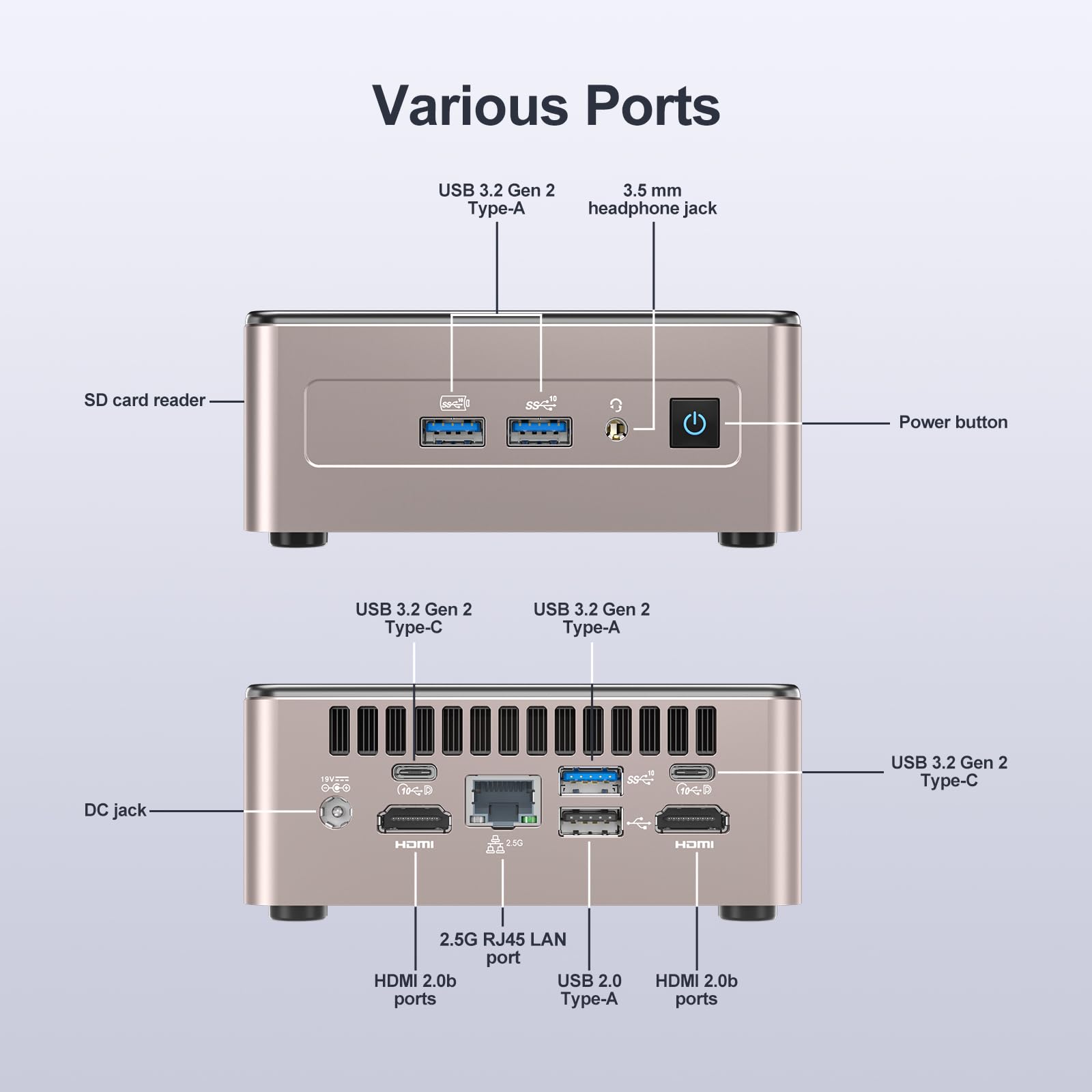 - Drahtlose Konnektivität: Dieser Mini-Desktop-Computer unterstützt Bluetooth v5.2 und WiFi 6, die eine schnelle und stabile drahtlose Verbindung mit Ihren Geräten und Netzwerken ermöglichen. Sie können auch die integrierten HDMI-, DisplayPort-, USB-C-, USB-A-, RJ45-, Audiobuchsen- und Micro-SD-Kartenleser-Anschlüsse für die Verbindung mit verschiedenen Peripheriegeräten und Zubehör nutzen.