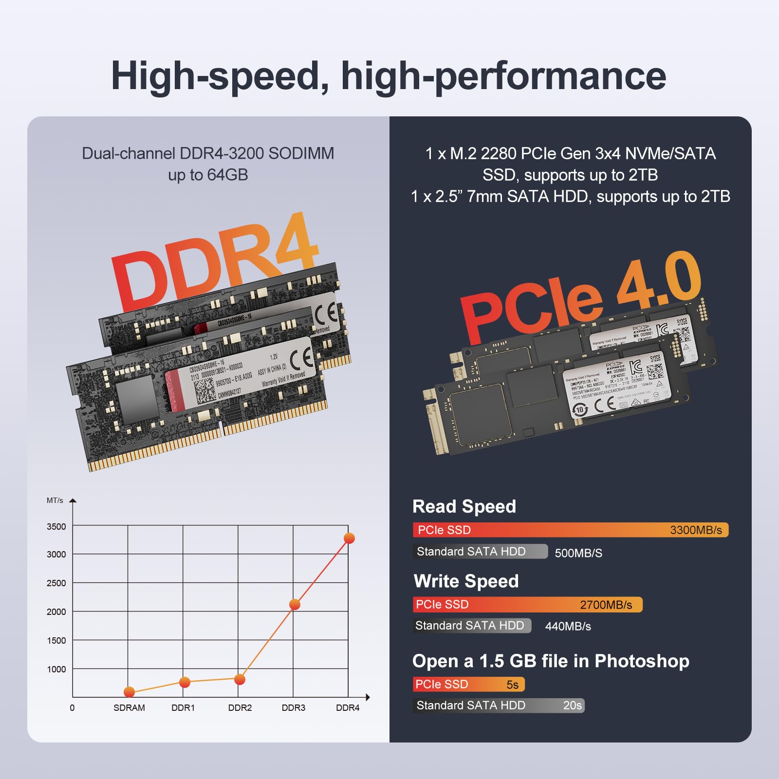 - Großer und schneller Speicher: Dieser Mini-PC ist mit Dual-Channel DDR4-3200 SODIMM-Speicher ausgestattet, der auf bis zu 64 GB erweitert werden kann, sowie mit zwei Speichersteckplätzen, einem für M.2 2280 PCIe Gen 3x4 NVMe/SATA SSD (bis zu 2 TB) und einem für 2,5" 7mm SATA HDD (bis zu 2 TB), die Ihnen viel Platz und Geschwindigkeit für Ihre Dateien, Programme und Spiele bieten.